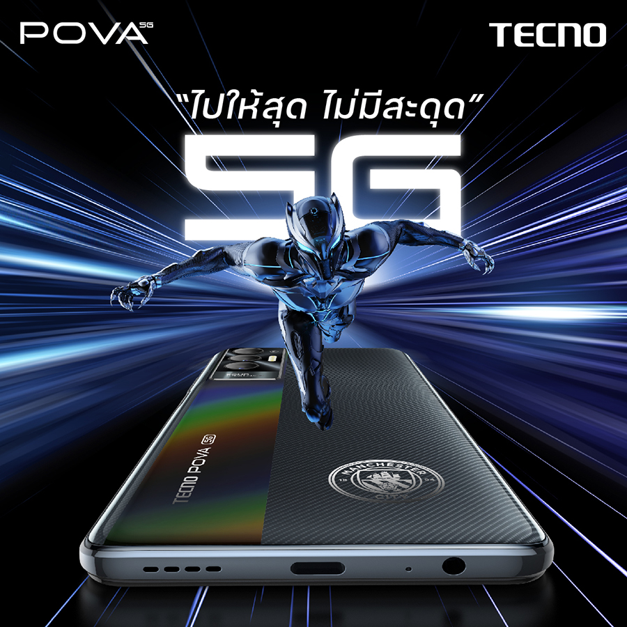 Tecno Pova 5G เป็นสมาร์ตโฟน 5G รุ่นแรกของแบรนด์ Tecno Mobile ที่มาพร้อมจุดเด่นหน้าจอแสดงผลขนาดใหญ่พิเศษ 6.9 นิ้ว ความละเอียดระดับ Full HD+ รองรับอัตรารีเฟรชเรทไหลลื่นสูงสุด 120Hz รองรับทุกการใช้งาน จัดเต็มความเร็วแรงด้วยชิปประมวลผล MediaTek Dimensity 900 5G ร่วมกับ RAM ขนาด 8GB แบบ LPDDR5 พร้อมฟีเจอร์เพิ่ม RAM เสมือนได้อีก 3GB และ ROM ขนาด 128GB แบบ UFS 3.1