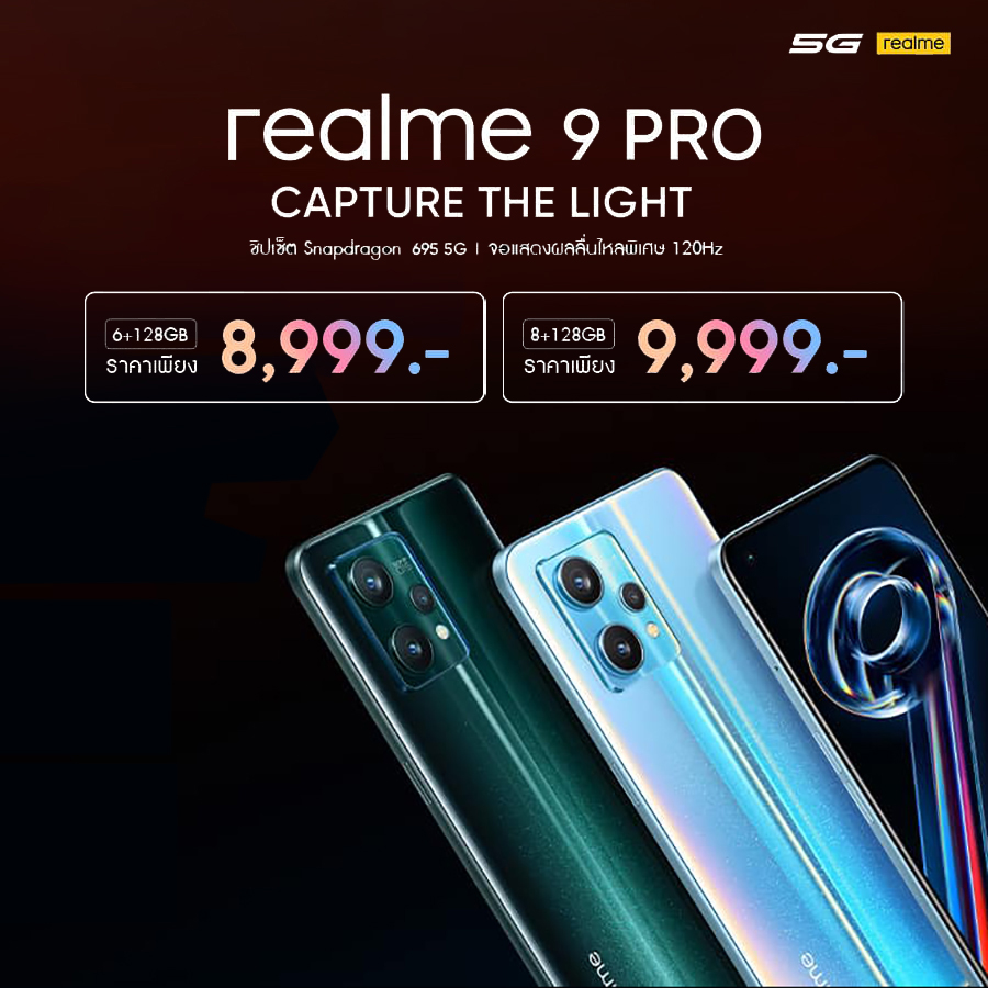 realme 9 Pro 5G วางจำหน่ายใน 2 เฉดสีสวยงาม ได้แก่ สีฟ้า Sunrise Blue และสีเขียว Arora Green พร้อมความจุรุ่นย่อยให้เลือกตามความต้องการใช้งาน 2 รุ่น คือ รุ่น RAM 6GB + ROM 128GB ราคา 8,999 บาท และ รุ่น RAM 8GB + ROM 128GB ราคา 9,999 บาท