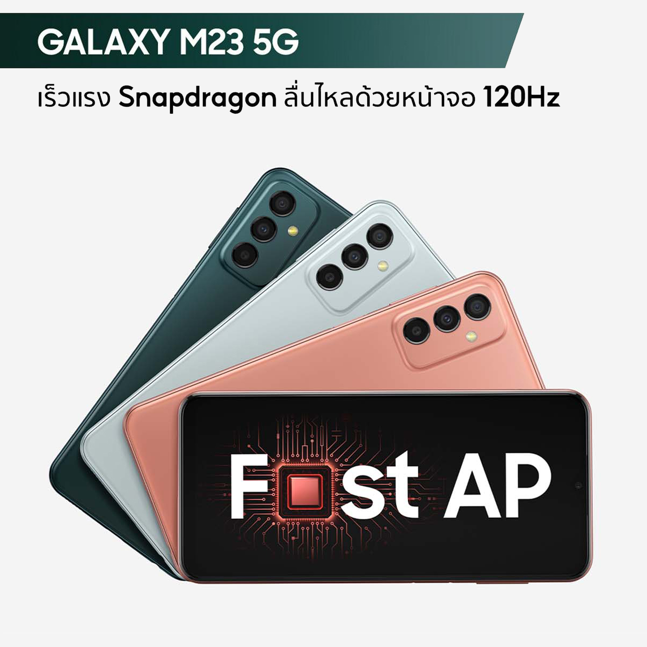 Samsung Galaxy M23 5G สมาร์ตโฟนระดับกลางรุ่นคุ้มค่าคุ้มราคาจากซัมซุง ที่อัดแน่นไปด้วยคุณภาพคับเครื่อง มาพร้อมหน้าจอ Infinity-V Display ขนาด 6.4 นิ้ว อัตรารีเฟรชเรทสูงสุด 120Hz และชิปประมวลผล Snapdragon750G สามารถเชื่อมต่อ 5G ได้อย่างรวดเร็ว ทำงานร่วมกับ ROM ขนาด 6GB + RAM ขนาด 128GB ที่สามารถเพิ่มหน่วยความจำผ่าน MicroSD Card ได้สูงสุดถึง 1TB และยังมาพร้อมด้วยระบบเสียง Dolby Atmos ให้พลังเสียงคมชัด สมจริงทุกรายละเอียด
