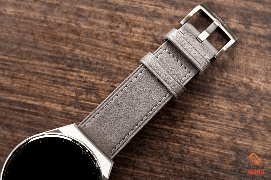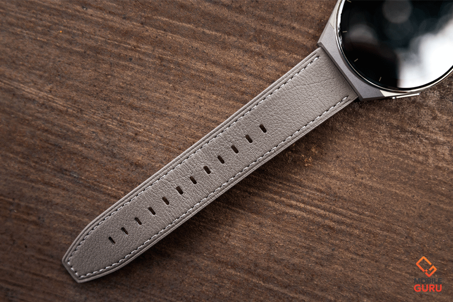 ตัวสายรัดข้อมือเป็นวัสดุหนังสีเทามีความกว้าง 22 มิลลิเมตร และยาว 140-210 มิลลิเมตร ตามการปรับระดับใช้งาน ซึ่งตัวสายสามารถถอดเปลี่ยนได้ด้วยการโยกสลักล็อคที่ขั้วสายฝั่งที่ยึดกับตัวเรือนนาฬิกาด้านหลัง สำหรับใครที่ใส่ออกกำลังกายแนะนำให้เปลี่ยนเป็นสายซิลิโคนจะเหมาะสมกว่าครับ