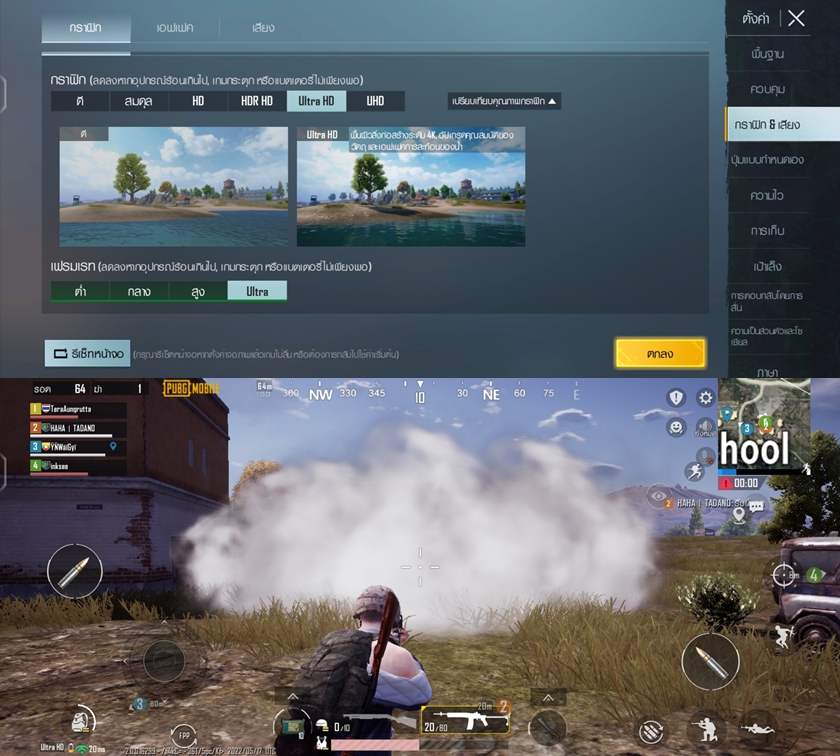 ส่วนเกม PUBG Mobile สามารถปรับกราฟิกระดับ Ultra HD และค่าเฟรมเรทระดับ Ultra ได้ทั้งคู่เลยครับ