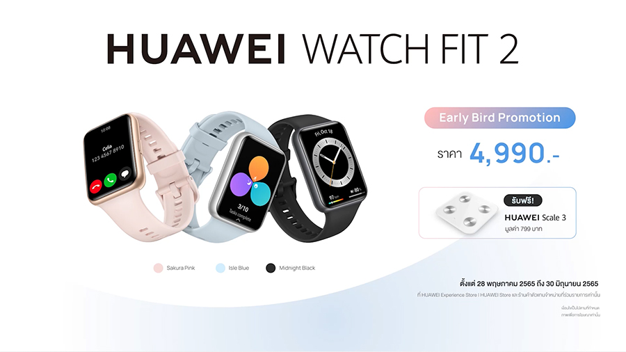 พร้อมโปรโมชันพิเศษเมื่อสั่งซื้อสินค้าก่อนใคร รับฟรี HUAWEI Scale 3 มูลค่า 799 บาท ตั้งแต่ 28 พฤษภาคม 2565 ถึง 30 มิถุนายน 2565 ที่หน้าร้าน HUAWEI Experience Store และร้านค้าที่ร่วมรายการ รวมถึงช่องทางออนไลน์อย่าง HUAWEI Store และร้านค้าอย่างเป็นทางการของหัวเว่ยบน Shopee, Lazada, JD Central, Thisshop และแอปพลิเคชัน My HUAWEI