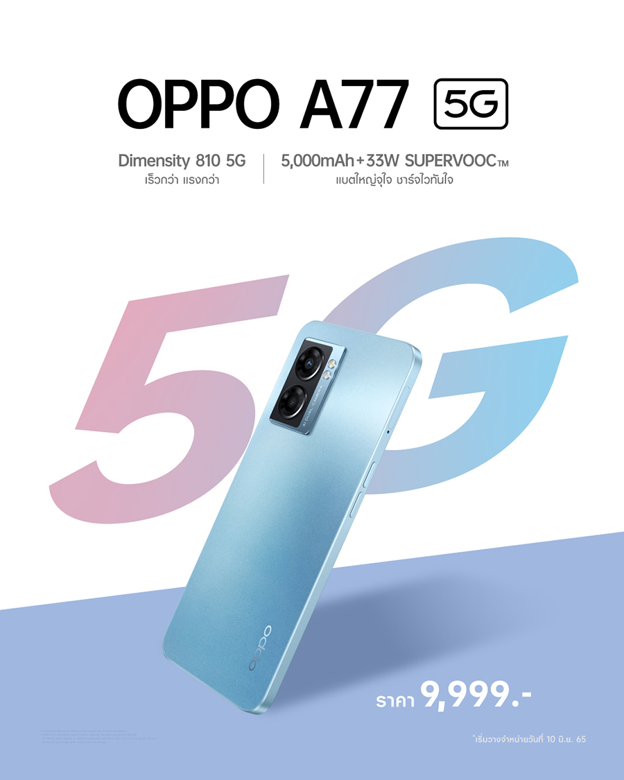 สัมผัสประสบการณ์ความเร็วแรงของ OPPO A77 5G สมาร์ตโฟน 5G ตัวจี๊ดสุดคุ้มได้ตั้งแต่วันที่ 10 มิถุนายน 2565 เป็นต้นไป ที่ OPPO Brand Shop ทุกสาขา และร้านค้าตัวแทนจำหน่ายทั่วประเทศ