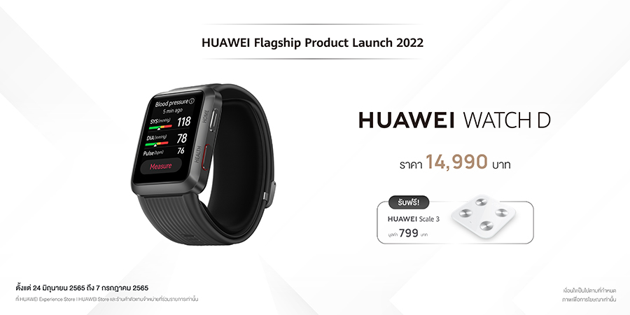 HUAWEI WATCH D วางจำหน่ายในประเทศไทยที่ราคา 14,990 บาท พิเศษ! รับทันที เครื่องชั่งน้ำหนัก HUAWEI Scale 3 มูลค่า 799 บาท เมื่อสั่งซื้อสินค้าในช่วงพรีออเดอร์ ตั้งแต่วันที่ 24 มิถุนายน - 7 กรกฎาคม 2565 ที่หน้าร้าน HUAWEI Experience Store และร้านค้าที่ร่วมรายการ รวมไปถึงช่องทางออนไลน์ HUAWEI Store และร้านค้าอย่างเป็นทางการของหัวเว่ยบน Shopee, Lazada และแอปพลิเคชัน My HUAWEI ดูข้อมูลผลิตภัณฑ์เพิ่มเติมได้ ที่นี่