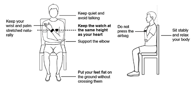 | TIPS! - ขั้นตอนการตรวจวัดความดันโลหิตด้วย HUAWEI WATCH D ให้ยกแขนข้างที่ใส่สมาร์ทวอทช์ขึ้นมาวางบริเวณหน้าอก โดยให้สมาร์ทวอทช์อยู่ในระดับเดียวกับหัวใจ จากนั้นเอามืออีกข้างประคองข้อศอกที่ใส่สมาร์ทวอทช์ไว้เพื่อรักษาระดับ วางเท้าให้ราบไปกับพื้น นั่งหลังตรง ปล่อยตัวตามสบาย พิงเก้าอี้ และเพื่อให้ผลการวัดออกมาถูกต้องมากที่สุด ขอให้นั่งพัก 5 นาทีก่อนการตรวจวัดความดันโลหิต |