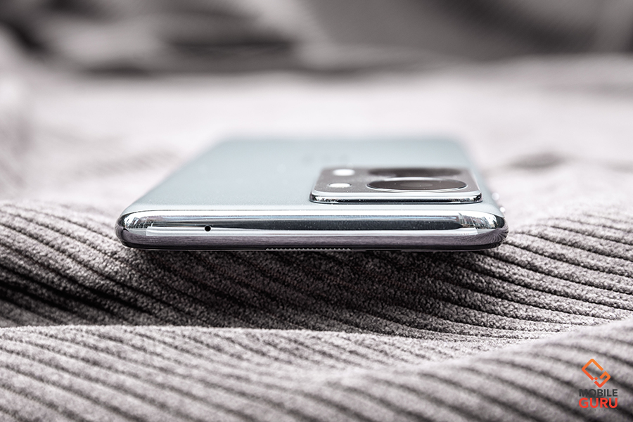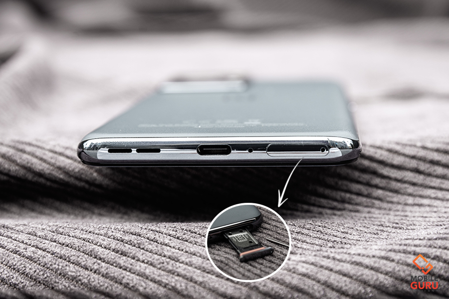 ตัวเครื่องด้านล่างมีถาดสำหรับใส่ซิมการ์ดแบบ Dual-SIM รองรับ Nano-SIM 2 ช่อง และไม่สามารถเพิ่มพื้นที่ความจำด้วย MicroSD Card ได้ ไมโครโฟนสนทนา, พอร์ตเชื่อมต่อสำหรับชาร์จแบตเตอรี่และถ่ายโอนพลังงาน/ข้อมูลแบบ USB Type-C และลำโพงเสียง