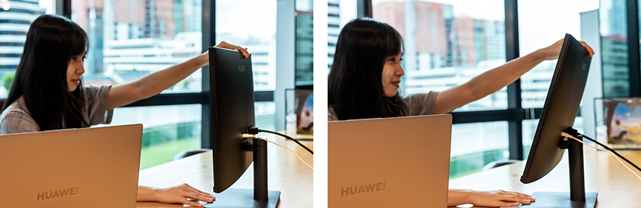 หน้าจอสามารถปรับระดับการแสดงผลได้แบบ Tilt Adjustment หรือปรับมุมมองได้แค่ 2 รูปแบบ เท่านั้นคือ เงยหน้าขึ้น สามารถเงยตัวจอจากมุมมองปกติได้อีกประมาณ 3 องศา และกดหน้าลง ซึ่งสามารถกดหน้าจอลงจากระดับเงยหน้าสุดได้ประมาณ 18 องศา เท่านั้นครับ