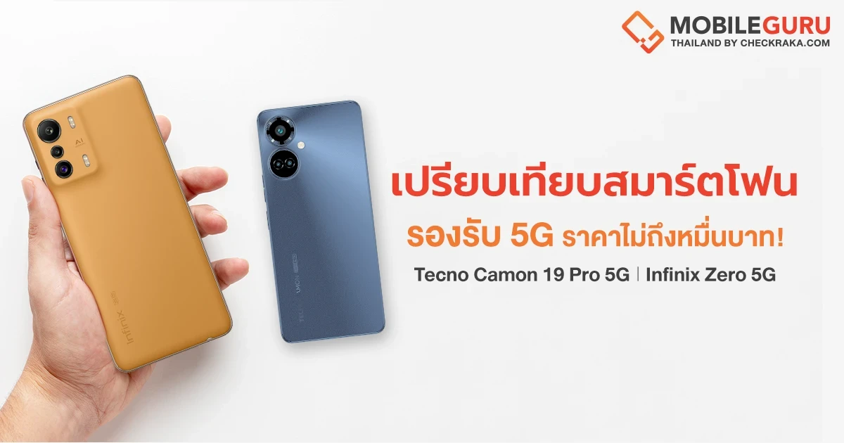 รอบนี้ผมเลยขอหยิบสองสมาร์ตโฟนสองรุ่นกระแสดีจากทั้งสองแบรนด์ และพึ่งเปิดตัวไปมาเปรียบเทียบให้เพื่อน ๆ ได้ตัดสินใจกันง่ายสักหน่อย โดยทั้งสองรุ่นที่ว่าประกอบด้วย Tecno Camon 19 Pro 5G และ Infinix Zero 5G ซึ่งเป็นสมาร์ตโฟน 5G ที่ถือว่ามีสเปกตัวเครื่องที่ดีเลยทีเดียว และยังรองรับสัญญาณเครือข่าย 5G ในไทยได้ครบทุกค่ายในราคาไม่ถึงหมื่นบาท! ด้วย เอาเป็นว่าไปสำรวจข้อมูลของทั้งสองรุ่นพร้อมกันได้เลย