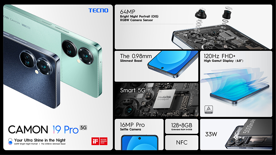 Tecno Camon 19 Pro 5G มีจุดขายด้านงานออกแบบตัวเครื่องในเรื่องของเพรียวบาง และพรีเมี่ยม โดยมีขอบจอบางเพียง 0.98 มิลลิเมตร และมีมิติตัวเครื่องกว้าง 74.31 x สูง 166.65 x หนา 8.58 มิลลิเมตร
