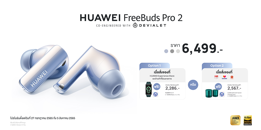 อย่าพลาด! หากสายเล่นเครื่องเสียงและหูฟังตัวจริงอยากรู้ว่า HUAWEI FreeBuds Pro 2 ตัวนี้เสียงดีขนาดไหน ก็คงต้องหามาลองพิสูจน์กับหูตัวเองเท่านั้น โดย HUAWEI FreeBuds Pro 2 มีราคาค่าตัวที่ 6,499 บาท พรีออเดอร์ระหว่างวันที่ 27 กรกฎาคม 2565 ถึง 5 สิงหาคม 2565 ที่หน้าร้าน HUAWEI Experience Store และร้านค้าที่ร่วมรายการ รับฟรี! HUAWEI Band 6 มูลค่า 1,899 บาท และ HUAWEI Music Premium ฟรี 3 เดือน มูลค่า 387 บาท