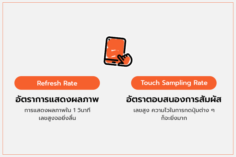 Refresh Rate หรืออัตรารีเฟรชเรทจอภาพ เป็นค่าตัวเลขการแสดงผลภาพใน 1 วินาที เช่น 144Hz หมายความว่าสามารถแสดงผลภาพได้สูงสุด 144 ภาพต่อวินาที ( >> [Techno Vocab] รู้ศัพท์ไอที 1 : Refresh Rate คืออะไร? ) ส่วน Touch Sampling Rate เป็นค่าความไวในการตอบสนองต่อการสัมผัสของหน้าจอ ตัวเลขยิ่งสูง ความไวในการบังคับหรือกดปุ่มต่าง ๆ ก็จะยิ่งมากขึ้น ค่าความไวสูงสุดตอนนี้อยู่ที่ 720Hz