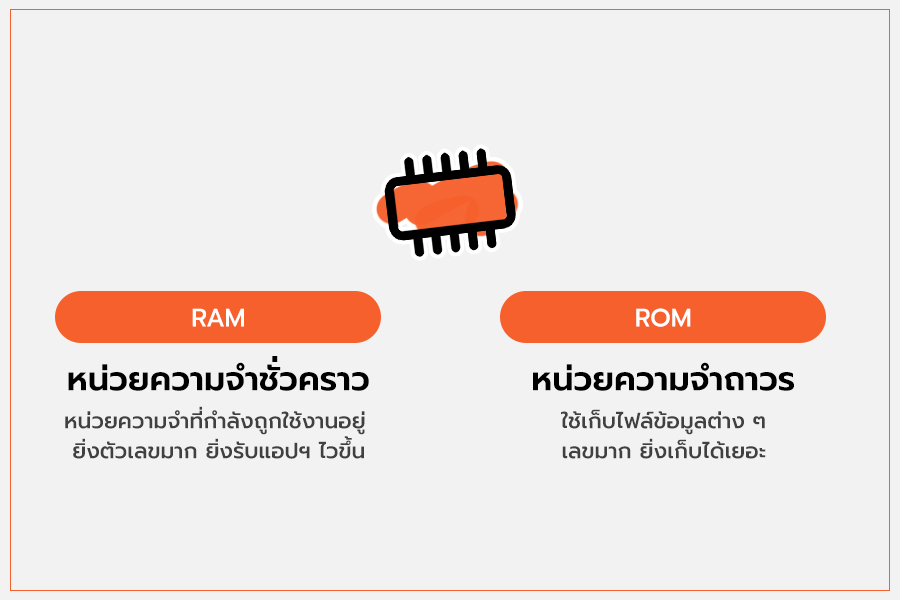RAM (Random Access Memory) เป็นหน่วยความจำชั่วคราวหรือหน่วยความจำที่กำลังถูกใช้งานอยู่ ช่วยเสริมการรันแอปพลิเคชันต่างๆ ยิ่งตัวเลขมาก ยิ่งส่งผลให้ไวขึ้น ส่วน ROM (Read Only Memory) เป็นหน่วยความจำถาวร ซึ่งใช้สำหรับเก็บไฟล์ข้อมูลต่าง ๆ ยิ่งตัวตัวเลขมาก ก็ยิ่งเก็บได้เยอะ