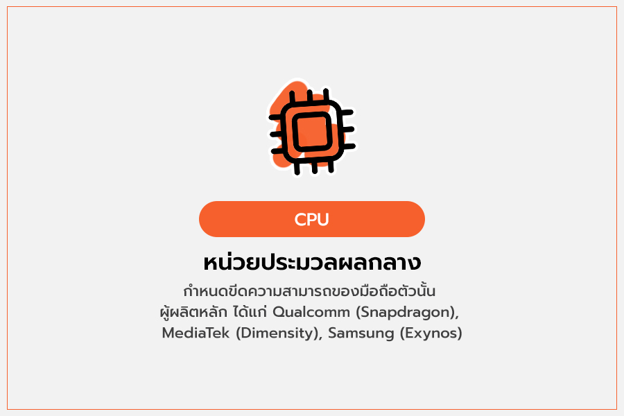 CPU (Central Processing Unit) คือ หน่วยประมวลผลกลาง ทำหน้าที่เป็นเหมือนมันสมอง ซึ่งเป็นตัวกำหนดขีดความสามารถของมือถือรุ่นนั้น ๆ ซึ่ง CPU เป็นหนึ่งในส่วนประกอบสำคัญบน SoC (System-on-Chip) โดย SoC บนมือถือมีผู้ผลิตหลักๆ คือ Qualcomm, MediaTek, HiSilicon, Samsung, Apple และจะมีชื่อเรียกแตกต่างกันออกไปตามผู้ผลิตอีกที เช่น Snapdragon ของ Qualcomm, Dimensity ของ MediaTek, Exynos ของ Samsung เป็นต้น
