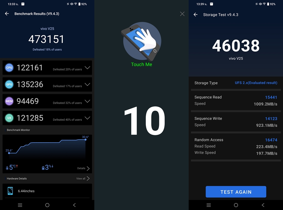 - ทดสอบความเร็ว Storage การอ่านอยู่ที่ 1009.2 MB/s และการเขียน 923.1 MB/s (UFS 2.2)