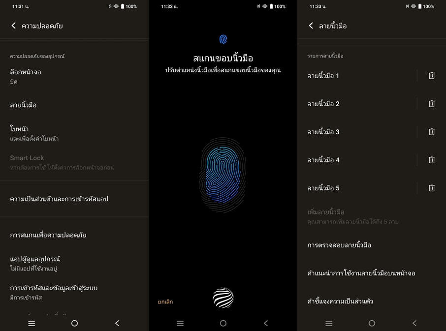 vivo V25 5G รองรับเซ็นเซอร์สแกนลายนิ้วมือใต้หน้าจอ รองรับสูงสุด 5 ลายนิ้วมือ และรองรับแสกนใบหน้า ความเร็วและความแม่นยำทำได้ดีมาก และสามารถปรับแต่งเอฟเฟคสแกนลายนิ้วมือได้อย่างหลากหลาย