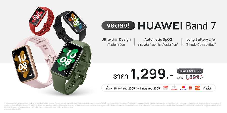 HUAWEI Band 7 มีให้เลือกถึง 4 สี 4 สไตล์ ได้แก่ สีดำ Graphite Black, สีชมพู Nebula Pink, สีเขียว Wilderness Green และสีแดง Flame Red พร้อมโปรโมชันสุดคุ้มโดนใจสำหรับช่วงพรีออเดอร์ให้ลูกค้าชาวไทยจับจองเป็นเจ้าของ HUAWEI Band 7 ในราคาพิเศษ 1,299 บาทเท่านั้น จากราคาปกติ 1,899 บาท เมื่อสั่งซื้อสินค้าผ่านช่องทางออนไลน์ HUAWEI Store และร้านค้าออนไลน์อย่างเป็นทางการของหัวเว่ยบนช่องทาง Shopee, Lazada, JD Central และ Thisshop ในระหว่างวันที่ 18 สิงหาคม 2565 ถึงวันที่ 1 กันยายน 2565