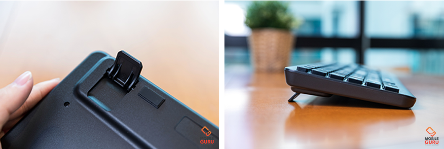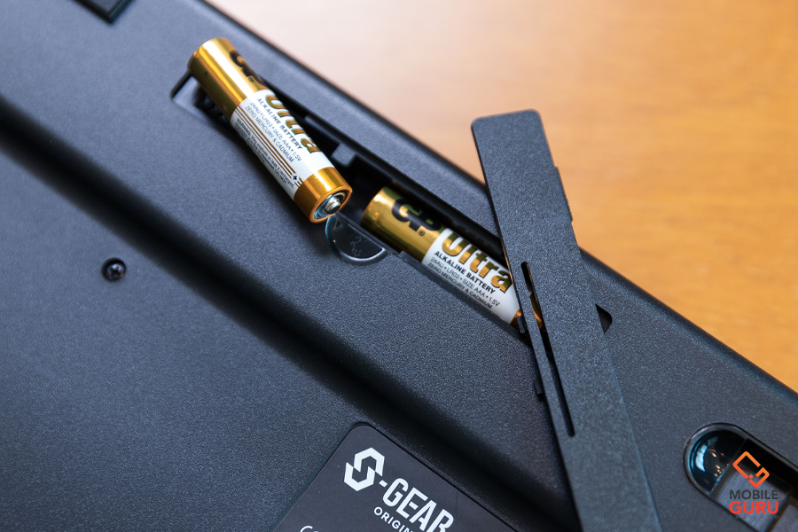ด้านหลังตัวคีย์บอร์ดจะเป็นตำแหน่งของขาตั้งปรับระดับคีย์บอร์ด รวมทั้งมียางกันลื่นให้ครบทั้ง 4 มุม และมีช่องสำหรับใส่ถ่าน โดยจะใช้ถ่านไฟฉายขนาด AAA จำนวน 2 ก้อน ในการทำงาน (มีแถมมาให้ในกล่อง)