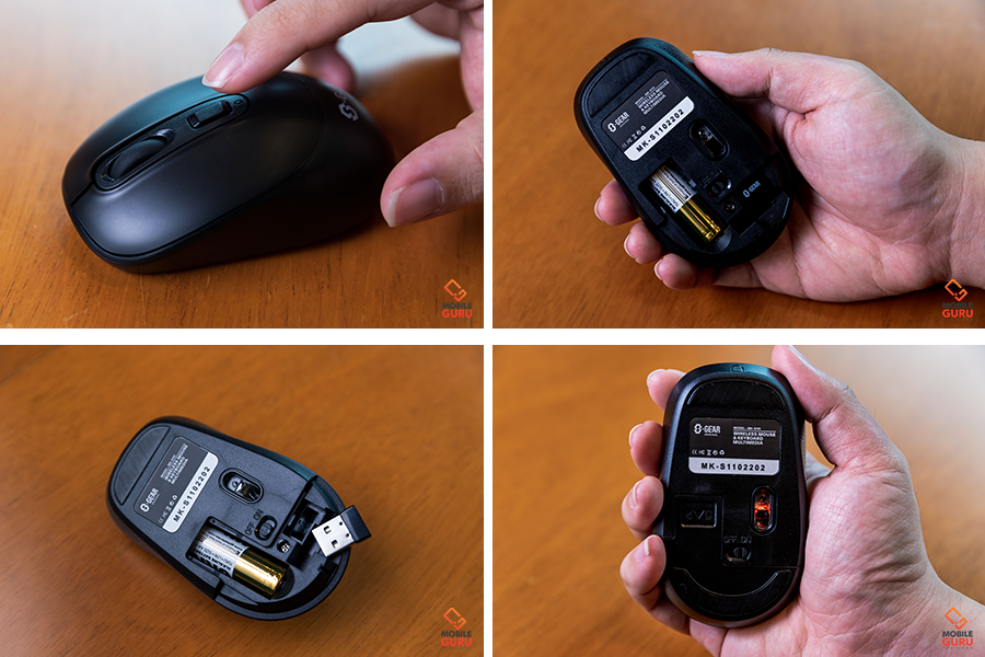 ในกล่องของ Keyboard Wireless Multimedia (MKS110) จะมีเมาส์ไร้สายมาด้วยนะครับ โดยเมาส์ตัวนี้รองรับการปรับระดับ DPI หรือความเร็วของตัวเป้าเคอร์เซอร์ได้ที่ปุ่มกดใกล้กับลูกกลิ้ง Scroll mouse ในขณะที่ด้านใต้ของตัวเมาส์จะเป็นตำแหน่งของช่องสำหรับใส่ถ่าน ซึ่งใช้ถ่านไฟฉายขนาด AA (มีแถมมาให้ในกล่อง) 1 ก้อน และเป็นที่เก็บตัว Receiver สำหรับใช้เชื่อมต่อเมาส์เข้ากับอุปกรณ์ต่าง ๆ