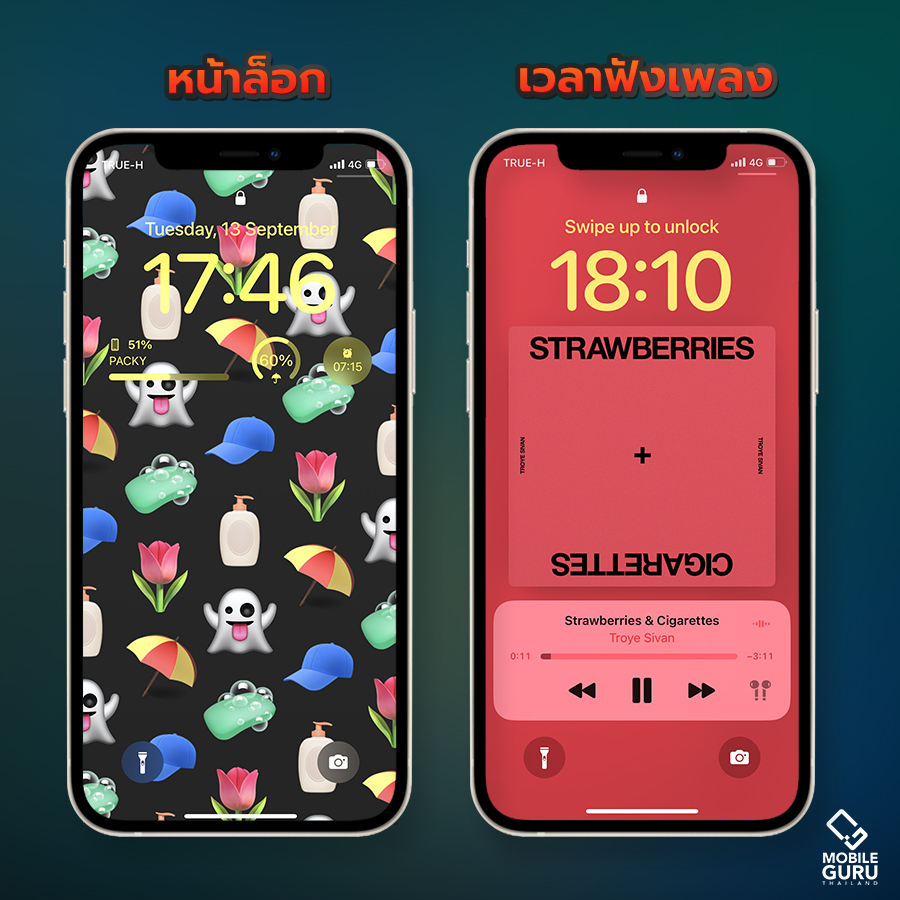 ตัวอย่างผลงานที่ปรับแต่งหน้าจอล็อกเป็นแบบ Emoji เรียบร้อยแล้ว ส่วนหน้าฟังเพลงก็เลือกเป็นอีกแบบ เก๋ไก๋ ไฉไล มีสไตล์สุดๆ