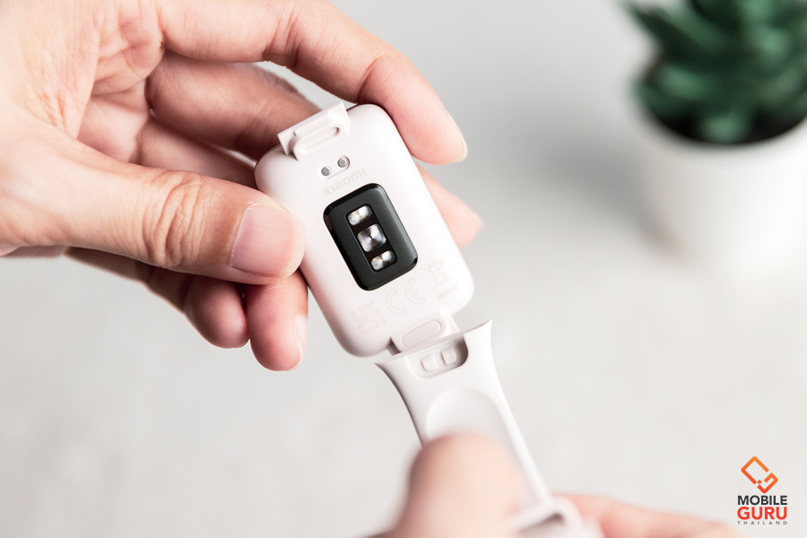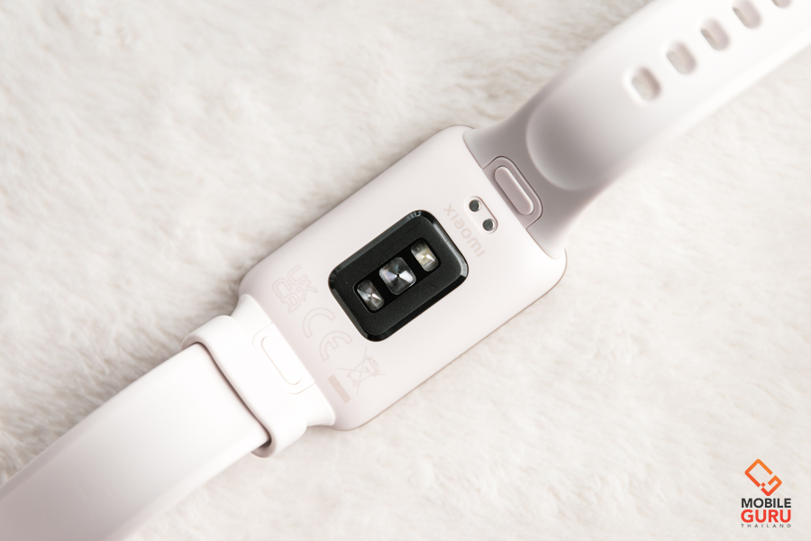 ด้านหลังตัวเรือน บริเวณตรงกลางจะเป็นตำแหน่งของเซ็นเซอร์การวัดทั้งหมด ประกอบด้วย accelerometer แบบ 3-axis, gyroscope sensors แบบ 3-axis, PPG (Photoplethysmography) sensor, Ambient-light และพอร์ตชาร์จ POCO Pin แบบ 2 Pin สำหรับชาร์จแบตเตอรี่