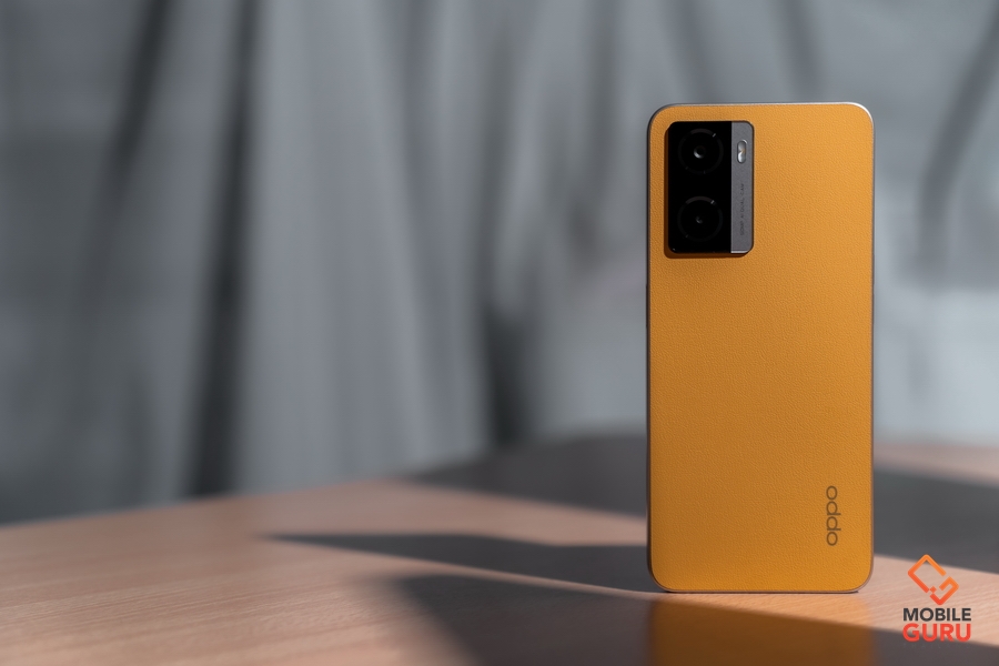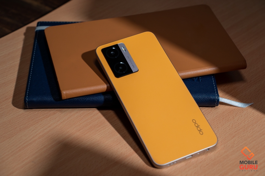 5. ดีไซน์หนังไฟเบอร์กลาสขอบเหลี่ยมสุดคลาสสิค สีส้ม Sunset Orange และดีไซน์ฝาหลังแบบ OPPO Glow สีดำ Starry Black