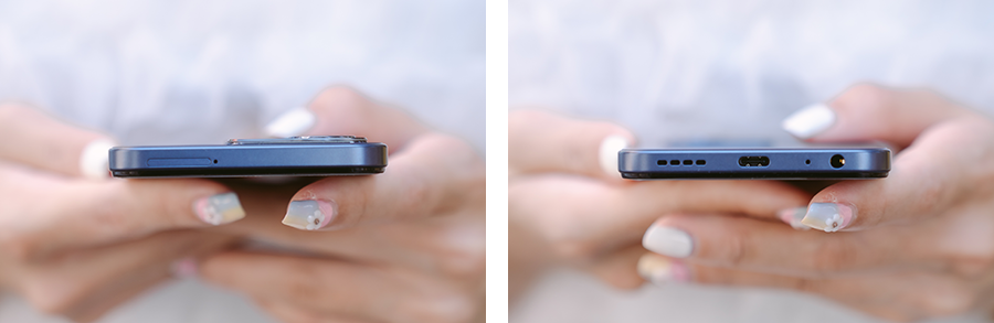 ขอบด้านข้างทรงเหลี่ยมทันสมัย ด้านบนมีช่องใส่ซิม และด้านล่างมีลำโพง, พอร์ท USB-C, ไมค์โครโฟน และพอร์ทหูฟัง 3.5 มม.
