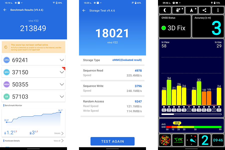 - ทดสอบประสิทธิภาพการทำงานด้วยแอปพลิเคชัน AnTuTu Benchmark ได้คะแนนรวม 213,849 คะแนน