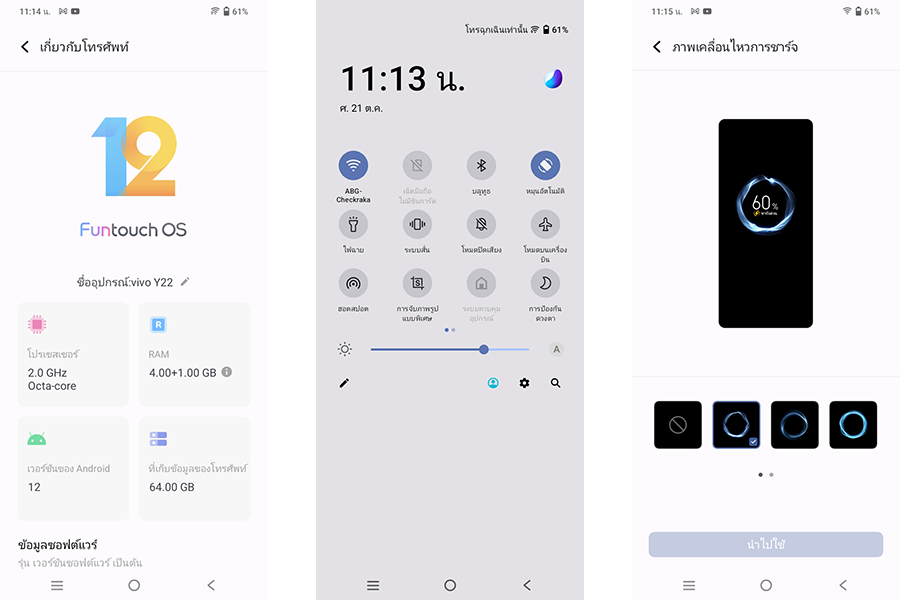 vivo Y22 ทำงานบน Android 12 ครอบทับด้วย Funtouch 12 บนสเปก MediaTek Helio G85 (12nm), RAM 4GB + 4GB (Extended RAM), ROM 64GB รองรับ microSDXC หน้าตาน่าใช้มากๆครับ ความเร็วและความลื่นไหลทำได้ดี สามารถปรับแต่ง Effect ต่างๆ ในเครื่องได้ พร้อมฟีเจอร์ Clone App สามารถใช้งานแอปพลิเคชันที่รองรับ ได้พร้อมกันสองไอดีในเครื่องเดียว, Multi Windows ฟีเจอร์เปิดใช้งานแอปพลิเคชันพร้อมกัน 2 หน้าจอ และฟีเจอร์เด่นๆ อีกมากมายสมเป็นสมาร์ทโฟนวีโว่