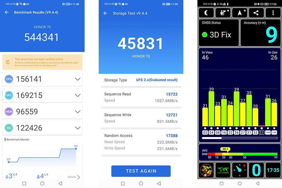 - ทดสอบประสิทธิภาพการทำงานด้วยแอปพลิเคชัน Antutu Benchmark ได้คะแนนรวม 544,341 คะแนน