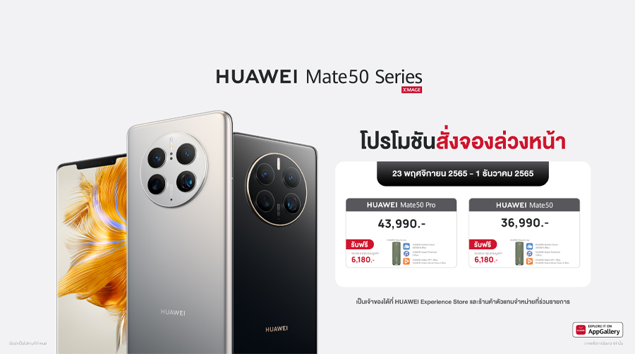 HUAWEI Mate 50 Pro มาในราคา 43,990 บาท และ HUAWEI Mate 50 ราคา 36,990 บาท และติดตามการเปิดตัวอย่างเป็นทางการ พร้อมโปรโมชันพรีออเดอร์อันน่าตื่นเต้นได้ในวันที่ 23 พฤศจิกายน - 1 ธันวาคม 2565 สำหรับผู้ที่สั่งจองช่วงพรีออเดอร์รับฟรี HUAWEI Sound Joy มูลค่า 4,999 บาท