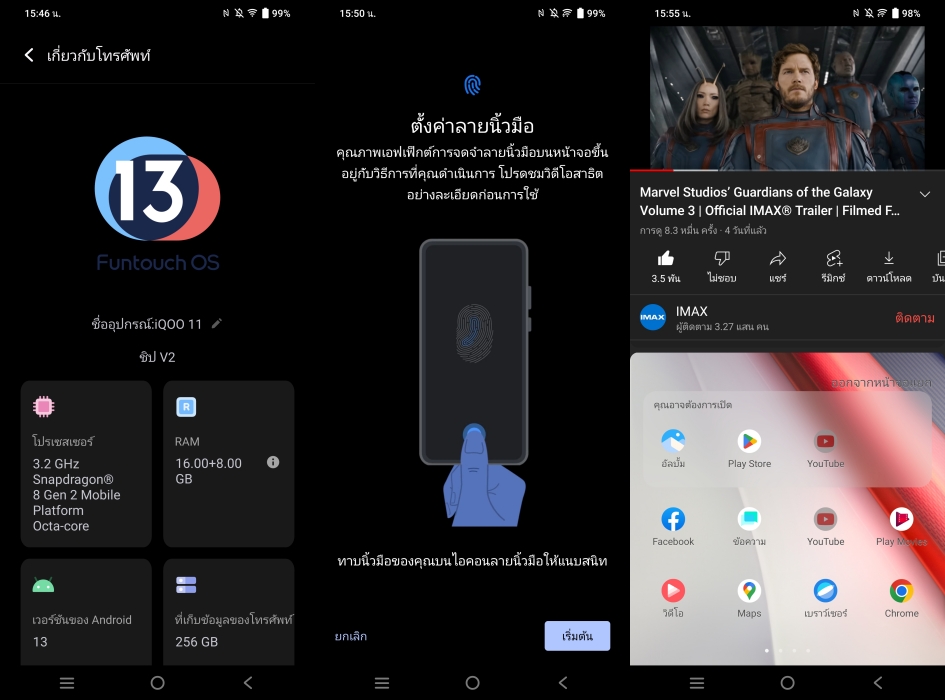 iQOO 11 5G ทำงานบน Android 13 ครอบทับด้วย Funtouch 13 หน้าตา UI สวยงาม และลูกเล่นใส่มาเยอะตามแบบฉบับของ Funtouch ซึ่งใครที่ติดการใช้ Origin OS ต้องปรับตัวนิดหน่อยนะครับ แต่ผมว่าไม่ผิดหวังแน่นอนครับ เพราะ Funtouch OS ขึ้นชื่อว่ามีความสเถียรสูง แถมสวยงามน่าใช้มากๆ