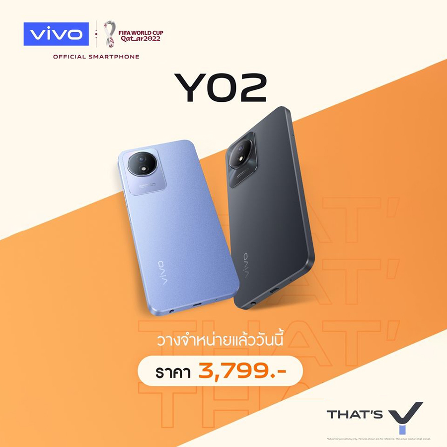 vivo Y02 สมาร์ตโฟนดีไซน์เรียบหรู แบตเตอรี่ใหญ่จุใจ 5,000mAh พร้อมความจุ RAM 2GB + ROM 32GB (เพิ่มเมมได้อีก 1TB) มีให้เลือก 2 สี คือ สีเทา Cosmic Grey และสีฟ้า Orchid Blue วางจำหน่ายในราคาเพียง 3,799 บาท สามารถจับจองเป็นเจ้าของได้แล้วที่ vivo Brand Shop ทุกสาขา รวมไปถึง BaNANA, IT City | CSC, Jaymart, TG FONE, KINGKONG, BKK, Big C, Maxlink, Powerbuy, Lotus, STAMP, Advice, Power Mall และร้านค้าตัวแทนจำหน่ายทั่วประเทศ