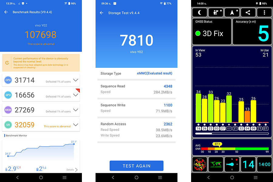 - ทดสอบประสิทธิภาพการทำงานด้วยแอปพลิเคชัน AnTuTu Benchmark ได้คะแนนรวม 107,698 คะแนน