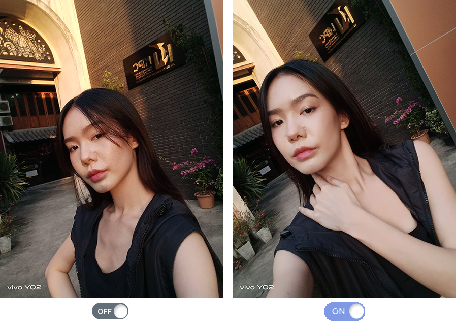 กล้องหลัง - vivo Y02 มาพร้อมเลนส์ความละเอียด 8 ล้านพิกเซล ค่ารูรับแสงกว้าง f/2.0 และมีไฟแฟลช LED ในตัว มาพร้อมโหมดถ่ายภาพ Face Beauty, Photo, Video, Time-Lapse รองรับการบันทึกวิดีโอความละเอียดสูงสุด 1080P ที่ 30FPS, รองรับซูมดิจิตอลสูงสุด 4X, ถ่ายภาพ Bokeh ได้ และสามารถเปิด Flash เติมไฟเพื่อเพิ่มความสว่างให้ภาพได้ ซึ่งลูกเล่นและฟีเจอร์ต่าง ๆ เรียกได้ว่ามีมาให้ไม่มาก สำหรับคนที่ชอบเล่นกล้องเป็นหลักอาจจะไม่ค่อยปลื้มสักเท่าไหร่ แต่ผลลัพธ์ภาพถ่ายที่ออกมาก็ถือว่าทำได้ดีกว่าที่คิดไว้มาก โทนสีสวย ให้คะแนนความประทับใจไปค่ะ