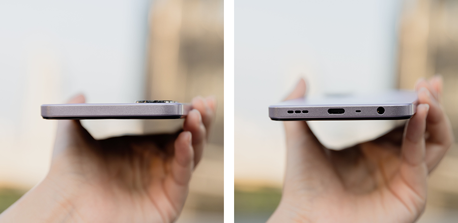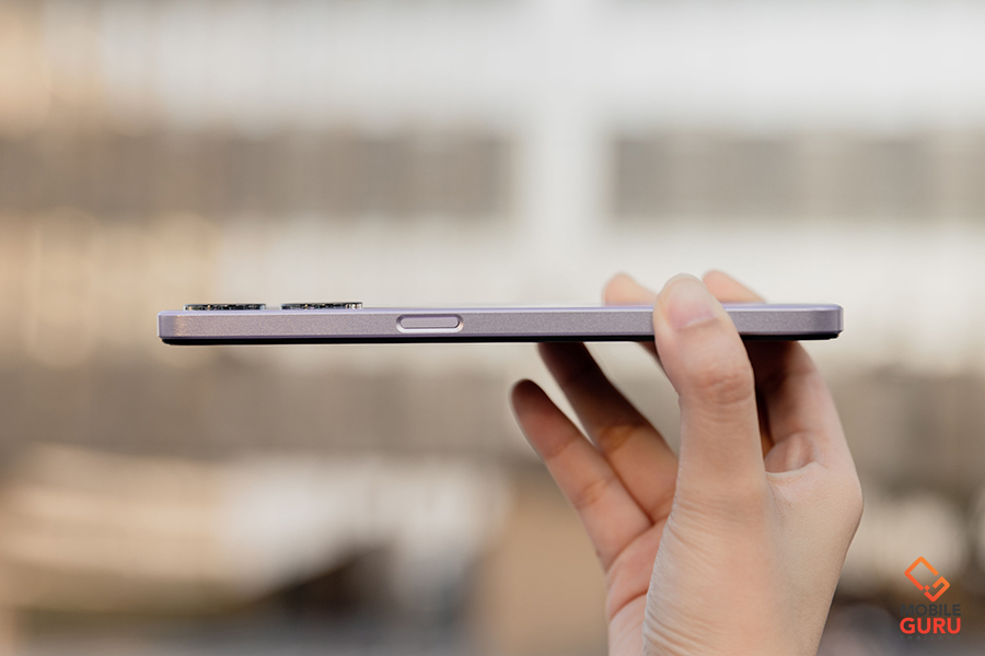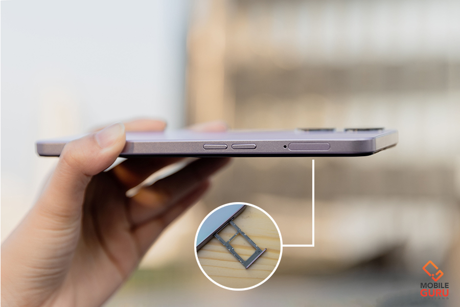 ด้านซ้ายของตัวเครื่องมีถาดสำหรับใส่ซิมการ์ดแบบ Hybrid Slot รองรับการใช้ 2 Nano-SIM หรือ 1 Nano-SIM + 1 microSD Card ที่สามารถเพิ่มพื้นที่ความจำได้สูงสุดถึง 1TB ถัดลงมาด้านล่างจะเป็นปุ่มปรับเพิ่ม-ลดระดับเสียง (Volume) ส่วนทางด้านขวาของตัวเครื่องมีปุ่ม Power สำหรับเปิด-ปิดเครื่องหรือพักการใช้งานหน้าจอ พร้อมรองรับการสแกนลายนิ้วมือไปในตัว