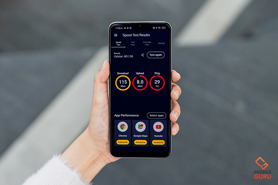 และจากการทดลองใช้งานมาหลายวันในช่วงนี้ ต้องบอกว่าในระดับพื้นฐาน เน้นใช้ทำงาน เช็กอีเมล แชทไลน์ คุยโทรศัพท์ เปิด Facebook, Instagram ไม่นานมาก ถ่ายรูปนิด ๆ หน่อย ๆ สามารถใช้ได้ยาว ๆ ตลอดวันเลยค่ะ ตกเย็นชาร์จแค่รอบเดียวก็เอาอยู่แล้ว ส่วนการใช้งานระดับที่ค่อนข้างหนักหน่วง เปิดหน้าจอ 90Hz และเปิดรับสัญญาณ 5G ไว้ตลอด หรือเล่นเกมยาว ๆ ดูซีรีส์ ฟังเพลง ถ่ายรูป ก็ต้องมีชาร์จระหว่างวันบ้าง 1-2 ครั้ง แล้วแต่การใช้งานจริง แต่ด้วยชาร์จไวที่ใส่มาให้ก็ทำให้การใช้งานคล่องตัวขึ้น แม้แบตฯ หมดก็ไม่สะดุด