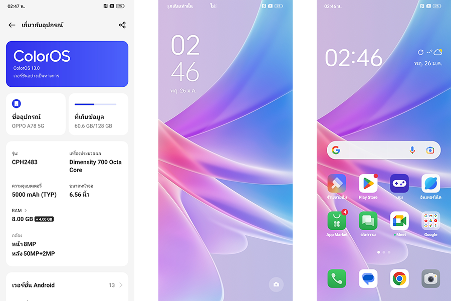 - ระบบปฏิบัติการ Android 13 ครอบทับด้วย ColorOS 13