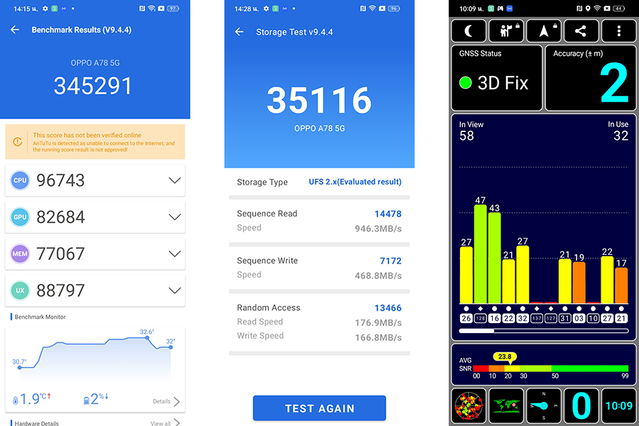 ทางด้านการประมวลผลขณะเล่นเกมบน OPPO A78 5G จากการทดสอบด้วยเกม ROV ทัชค่อนข้างแม่นยำ ลื่นติดนิ้วดี สามารถปรับกราฟิกระดับ HD ในระดับสูงมาก และปรับการแสดงผลระดับสูงได้ ภาพสวย คมชัด สามารถเล่นได้นิ่ง ๆ ที่ 45FPS ตลอดเกม ไม่หน่วง ทดลองลง Rank เล่นติดต่อกัน 3 รอบ (รอบละประมาณ 8 - 15 นาที) ช่วงเกมที่ 2 ตัวเครื่องจะเริ่มอุ่น ๆ แต่ก็ไม่ได้ร้อน ยังเล่นได้ชิล ๆ ยาว ๆ นอกจากนี้ OPPO A78 5G ยังมาพร้อม Game Mode ที่สามารถเลือกตั้งค่าประสิทธิภาพการเล่นเกมในแบบที่ต้องการได้ ได้แก่ โหมดใช้พลังงานต่ำโหมดสมดุล โหมดโปรเกมเมอร์ โหมดโฟกัสเกม รวมไปถึงการตั้งค่าสิ่งอำนวยความสะดวกระหว่างการเล่นเกม การปิดกั้นการแจ้งเตือน การปิดกั้นท่าทางการถ่ายภาพหน้าจอ การปิดกั้นท่าทางเปิดใช้งานหน้าจอแบ่งส่วน เพื่อป้องกันไม่ให้ถูกรบกวนในขณะเล่นเกม เอาเป็นว่าด้าน Gaming รุ่นนี้ก็ได้อยู่นะ ถือว่าดี ไม่ติดค่ะ