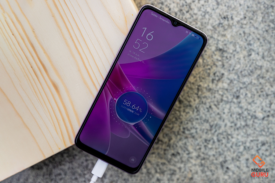 หน้าจอแสดงผล HD+ ชนิดจอ IPS LCD ขนาด 6.56 นิ้ว ความละเอียด 1,612 x 720 พิกเซล (269ppi) ค่าความสว่างสูงสุด 600 nits พร้อมรองรับอัตรา Refresh Rate สูงสุด 90Hz บนสัดส่วนพื้นที่การใช้งานหน้าจอต่อตัวเครื่อง 89.8% โดยมีมิติตัวเครื่องกว้าง 75.1 x สูง 163.8 x หนา 7.99 มิลลิเมตร และน้ำหนักตัวเครื่องโดยรวมประมาณ 188 กรัม