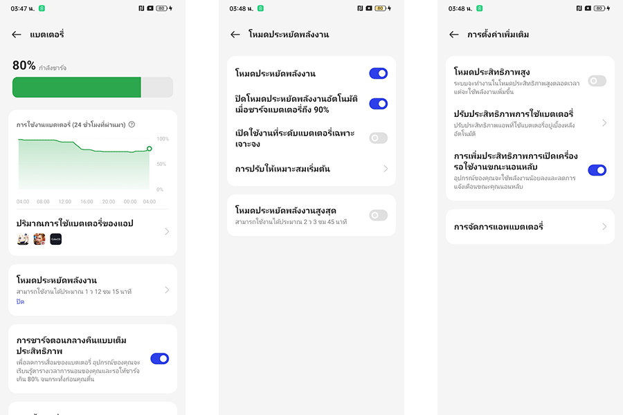 นอกจากนี้ OPPO A78 5G ยังมาพร้อมกับ Super Night-time Standby โหมดสแตนด์บายตอนกลางคืน ซึ่งเป็นอัลกอริธึมที่จะเรียนรู้และจดจำรูปแบบการนอนหลับของผู้ใช้ และช่วยลดการใช้พลังงานลงในเวลากลางคืน รวมไปถึง Super Power Saving Mode โหมดช่วยประหยัดพลังงานตัวเครื่อง เมื่อระดับแบตเตอรี่ลดเหลือเพียง 10% ข้อความแจ้งของระบบจะปรากฏขึ้นเพื่อให้แบตเตอรี่ที่เหลืออยู่ใช้ได้นานที่สุด สามารถเข้าไปเปิดใช้งานได้ที่ Settings > Battery > Power Saving Mode > On