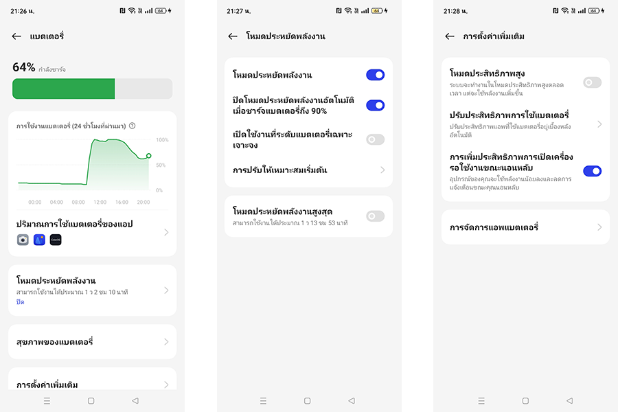 ทางด้านของโหมดเสริมการประหยัดพลังงานแบตเตอรี่ (Power Saving Mode) ทั้งโหมดประหยัดพลังงานสูงสุด (Super Power Saving Mode), การเพิ่มประสิทธิภาพการเปิดเครื่องรอใช้งานขณะนอนหลับ (Sleep Standby Optimization) รวมไปถึงการจัดการแอปแบตเตอรี่ต่าง ๆ ก็มีให้เลือกใช้งาน เอาเป็นว่าทั้งด้านการใช้งานและความปลอดภัยเกี่ยวกับแบตเตอรี่ก็จัดเต็มให้เหมือนกัน