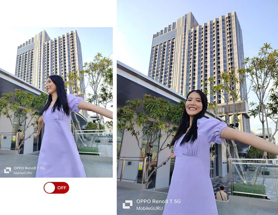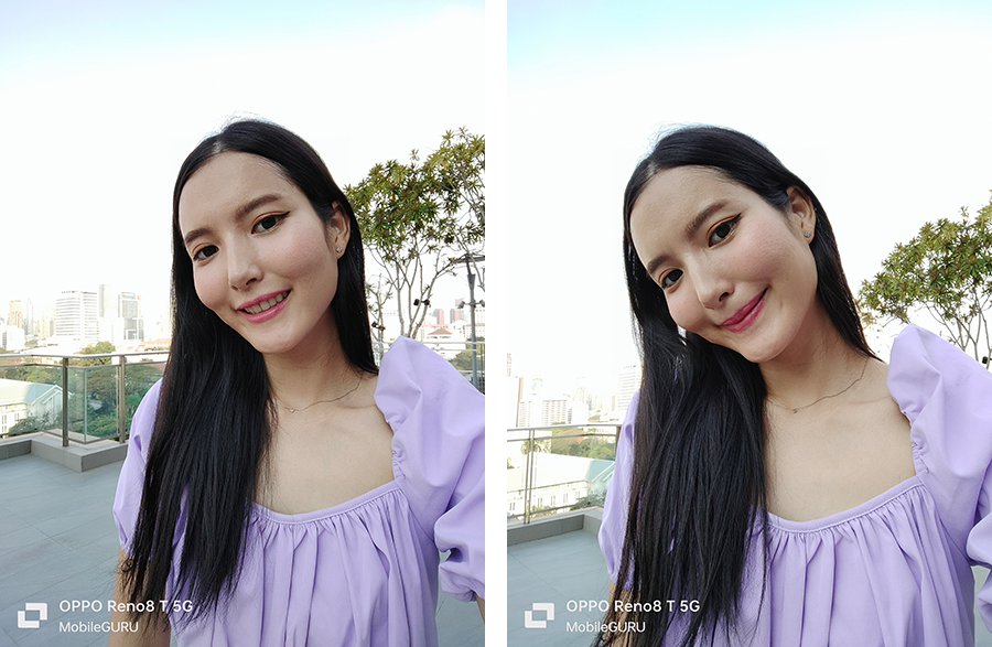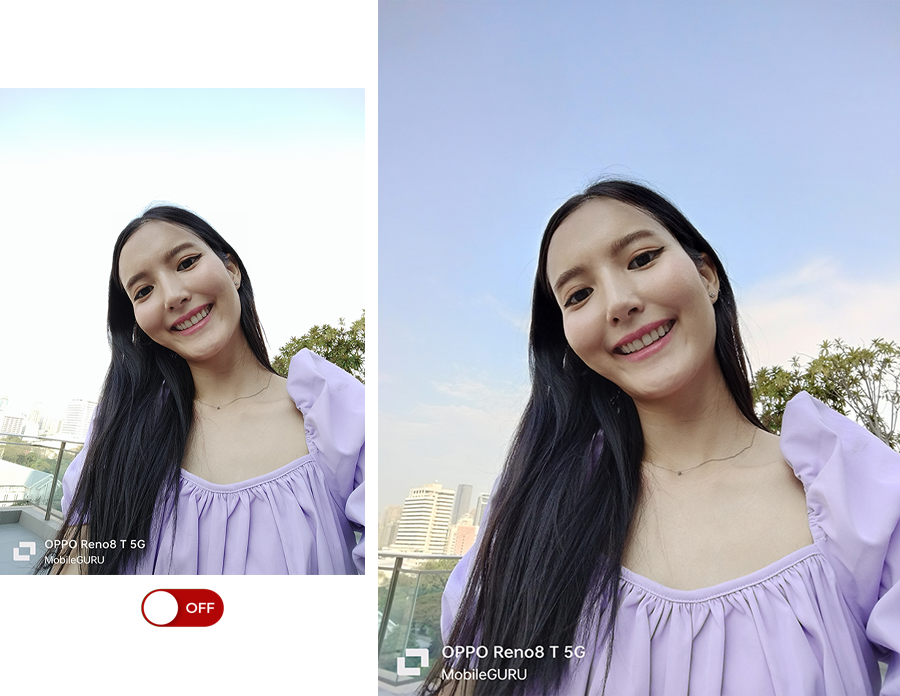 ถ่ายภาพย้อนแสงได้สวยงาม คมชัด โดยจะมีการปรับใบหน้าให้สว่างสดใส และขุดรายละเอียดของภาพให้ชัดเจน ไม่กลืนหายไปกับแสง ให้ผลลัพธ์ที่น่าประทับใจค่ะ ซึ่งจากภาพตัวอย่างด้านล่างนี้ ฟีเจอร์ HDR ทำให้เรามองเห็นรายละเอียดของท้องฟ้าได้อย่างชัดเจน ในขณะที่เมื่อปิด HDR รายละเอียดต่าง ๆ จะหายหมดเลย โดยฟีเจอร์ HDR รองรับการใช้งานทั้งกล้องหน้า-หลัง สามารถเปิดใช้งานโหมดได้ที่ Camera > Photo > ⋯ (จุดสามจุดด้านขวาบน) > HDR Auto
