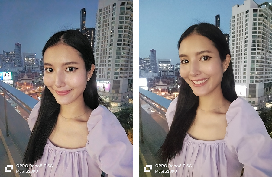 โหมดสำหรับการถ่ายเซลฟี่ตอนกลางคืนหรือในที่แสงสว่างน้อย เพิ่มความสว่างให้ใบหน้า (ภาพซ้าย) ซึ่งนอกเหนือจากการถ่ายในโหมด Night แล้ว เรายังสามารถเลือกเปิด Flash: Fill Light หรือไฟลบเงา เพื่อช่วยลบเงาและทำให้หน้าสว่างขึ้นได้ด้วย (ภาพขวา)