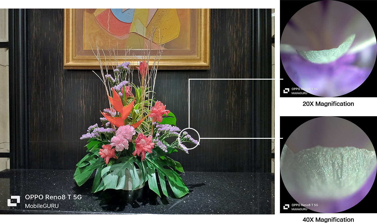 เพิ่มความสนุกให้การถ่ายภาพมากขึ้นไปอีก ด้วยลูกเล่นจากสมาร์ตโฟนรุ่นพี่ OPPO Find X3 Pro กับการถ่ายภาพในโหมด Microlens (กล้องจุลทรรศน์) ที่สามารถถ่ายภาพได้ด้วยกำลังขยาย 20 เท่า และ 40 เท่า เสมือนกำลังนั่งอยู่ในห้องเรียนวิทยาศาสตร์ เปิดมุมมองใหม่ในโลกใบเล็กที่จะไม่เหมือนเดิมอีกต่อไป สามารถเปิดใช้งานได้โดยเข้าไปที่ Camera > More > Microscope (ระยะโฟกัส 1 - 3 มิลลิเมตร)