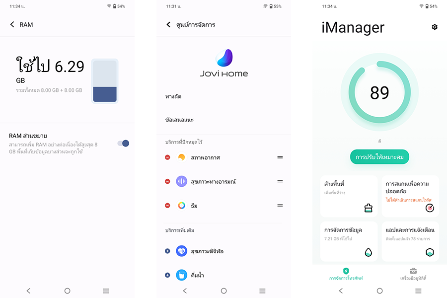 สามารถเลือกปรับอัตราการรีเฟรชจอภาพได้ 3 รูปแบบ ทั้งแบบสูง 90Hz แบบมาตรฐาน 60Hz และแบบสลับอัจฉริยะ การเรียกใช้งาน การเข้าถึงแอปพลิเคชัน/ฟีเจอร์ต่าง ๆ สามารถทำได้อย่างรวดเร็ว ลื่นไหล ไม่สะดุด ภาพรวมการใช้งานด้านความเร็วและความลื่นไหลถือว่าทำได้ดีเลยค่ะ นอกจากนี้ ยังมาพร้อมกับระบบอัจฉริยะ Jovi Home ที่สามารถสลับใช้งานกับ Google Smart Launcher ได้อย่างคล่องตัว รวมไปถึง iManager ฟีเจอร์ผู้ช่วยสำหรับช่วยตั้งค่าดูแลระบบต่าง ๆ