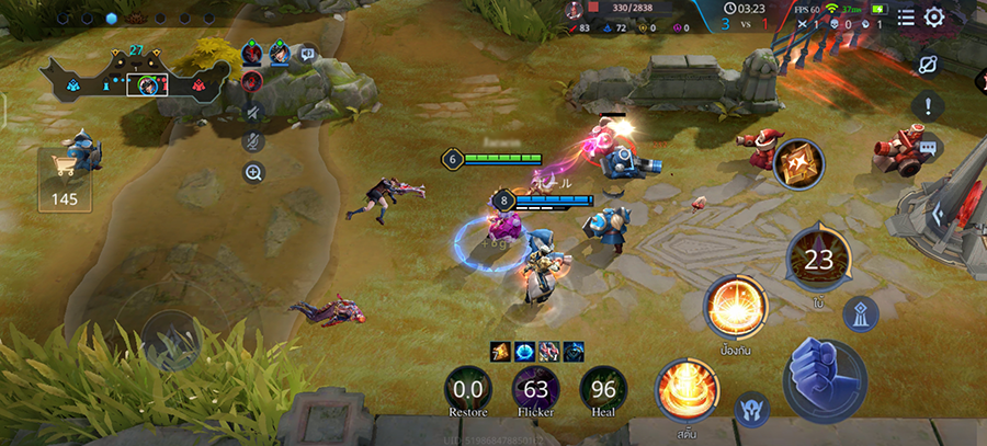 สำหรับประสิทธิภาพทางด้านการเล่นเกมบน vivo Y36 ก็จัดว่าให้ประสบการณ์การเล่นเกมที่ลื่นไหลดีค่ะ ทัชหน้าจอลื่นติดนิ้ว และจากการทดสอบด้วยเกม RoV สามารถปรับค่าภาพ HD ได้ในระดับสูงมาก ปรับการแสดงผลได้ในระดับสูง และสามารถเปิด FPS ในระดับสูงได้ด้วยเช่นกัน เฟรมเรทวิ่งอยู่ที่ 58FPS - 60FPS ตลอดเกม ซึ่งในช่วงเปิดสุดนี้ก็มีทัชหลุดและหน่วงอยู่บ้างเล็กน้อย แต่สามารถเล่นได้เรื่อย ๆ ค่ะ โดย vivo Y36 ยังมาพร้อมกับฟีเจอร์ Ultra Game Mode และ Multi-Turbo ที่สามารถปรับปรุงประสิทธิภาพการเล่นเกมให้ลื่นไหลยิ่งขึ้นอีกด้วย