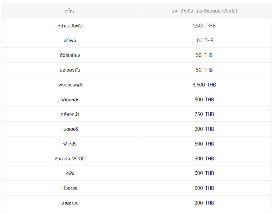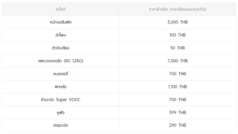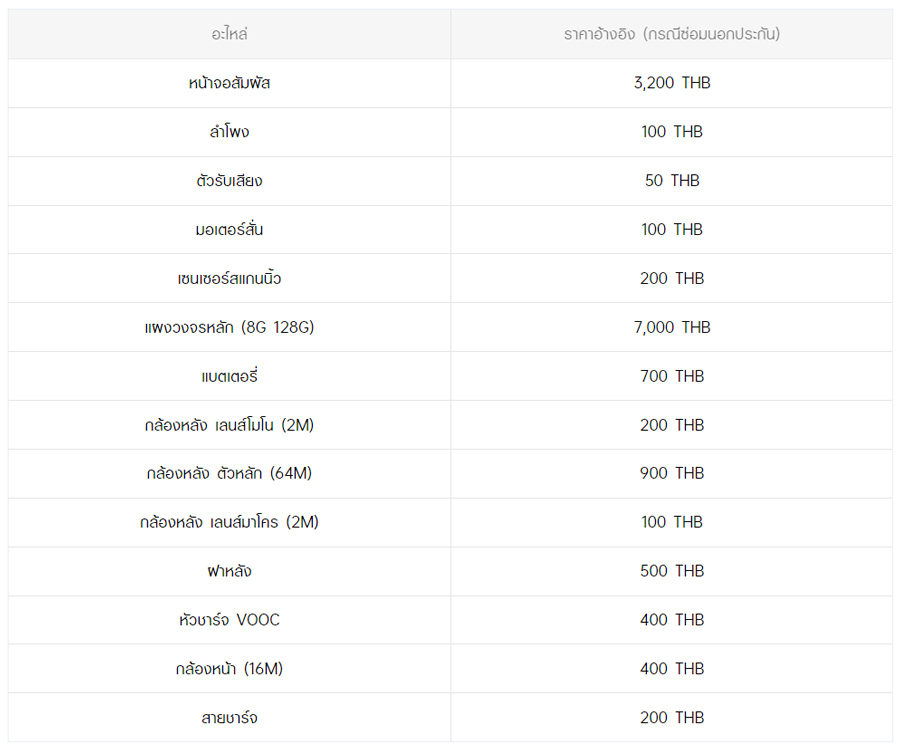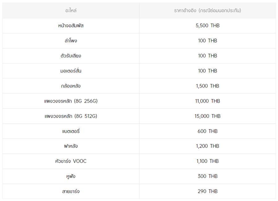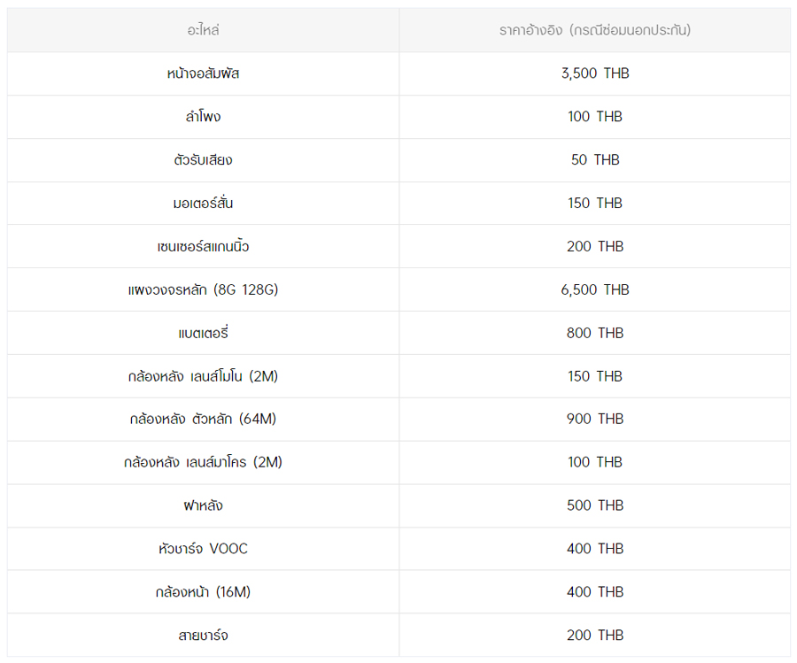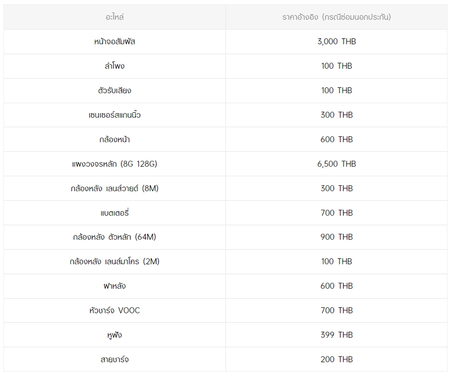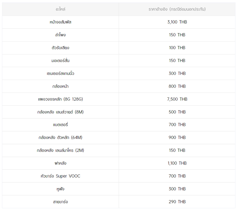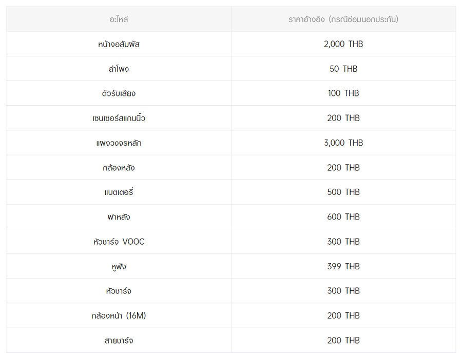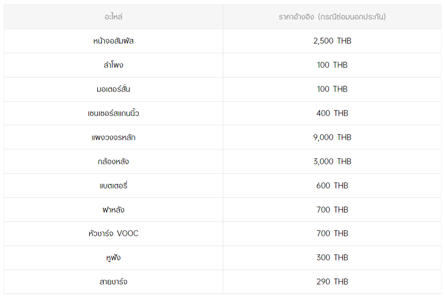 - หากต้องการทราบราคาในการซ่อมทั้งหมด สามารถสอบถามได้ ณ ศูนย์บริการออปโป้ หรือ OPPO Care