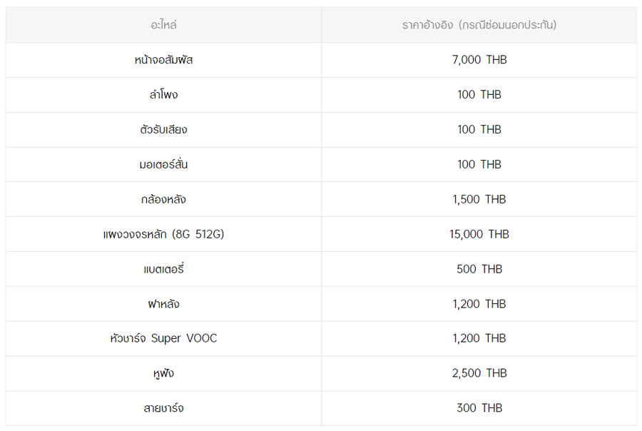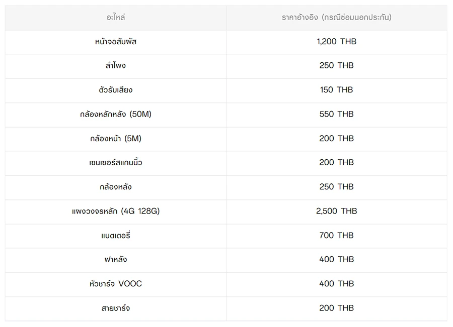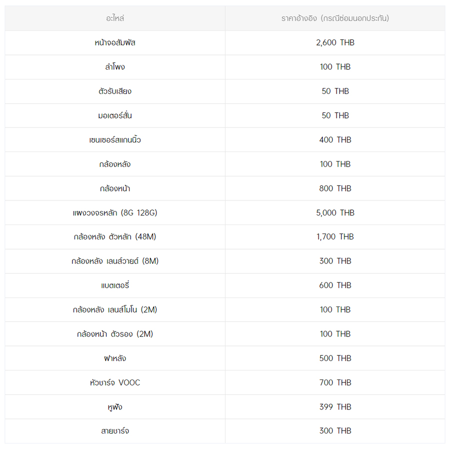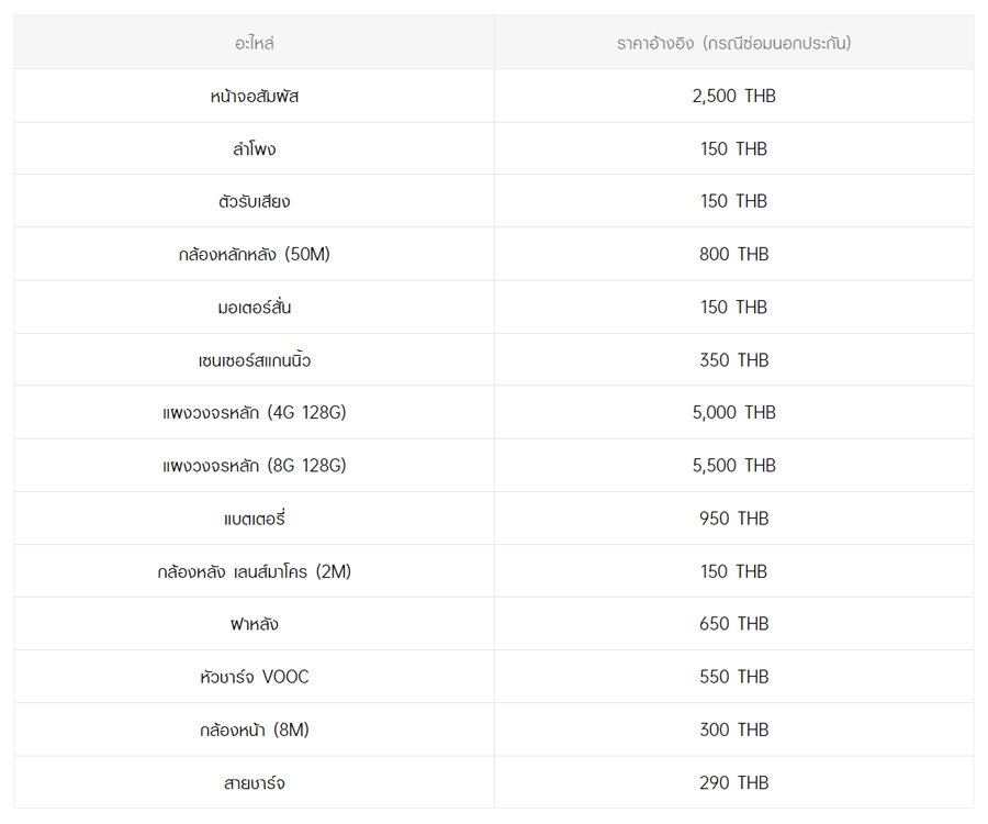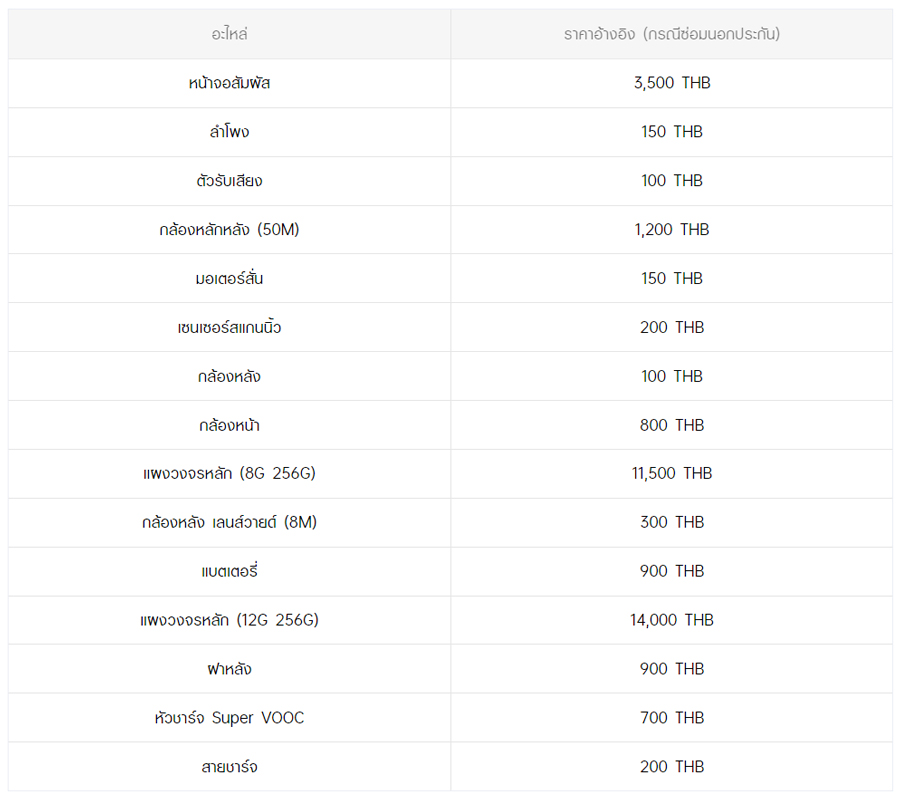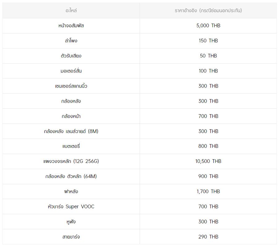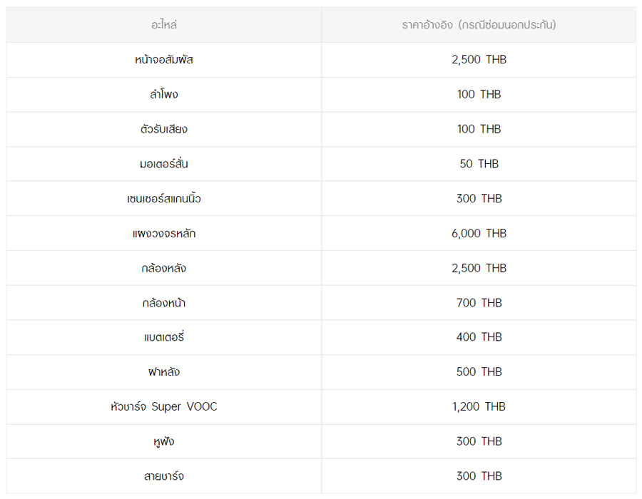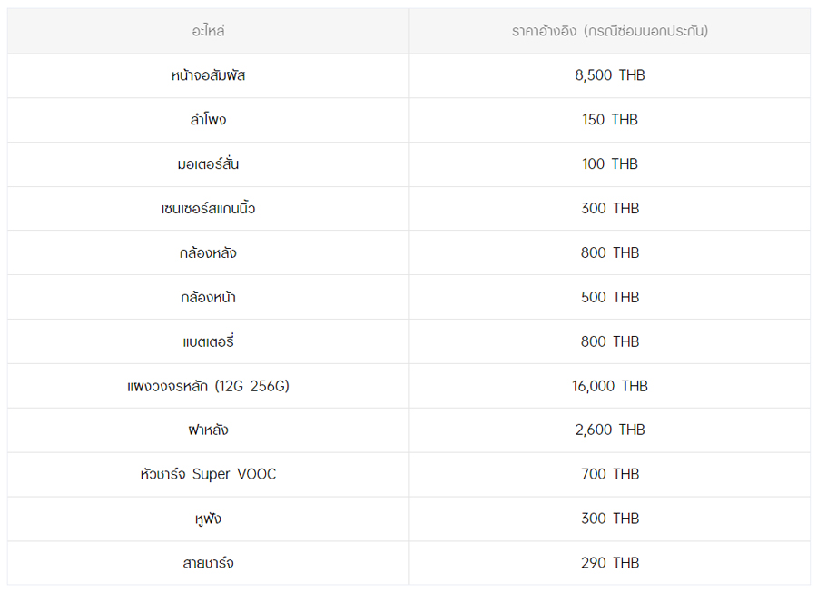 - หากต้องการทราบราคาในการซ่อมทั้งหมด สามารถสอบถามได้ ณ ศูนย์บริการออปโป้ หรือ OPPO Care