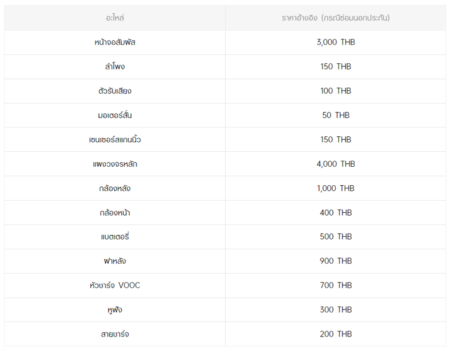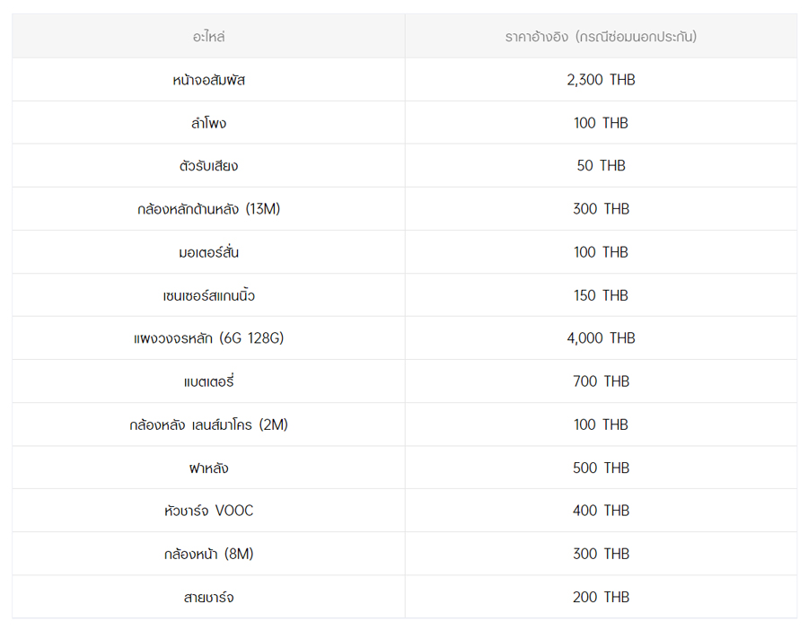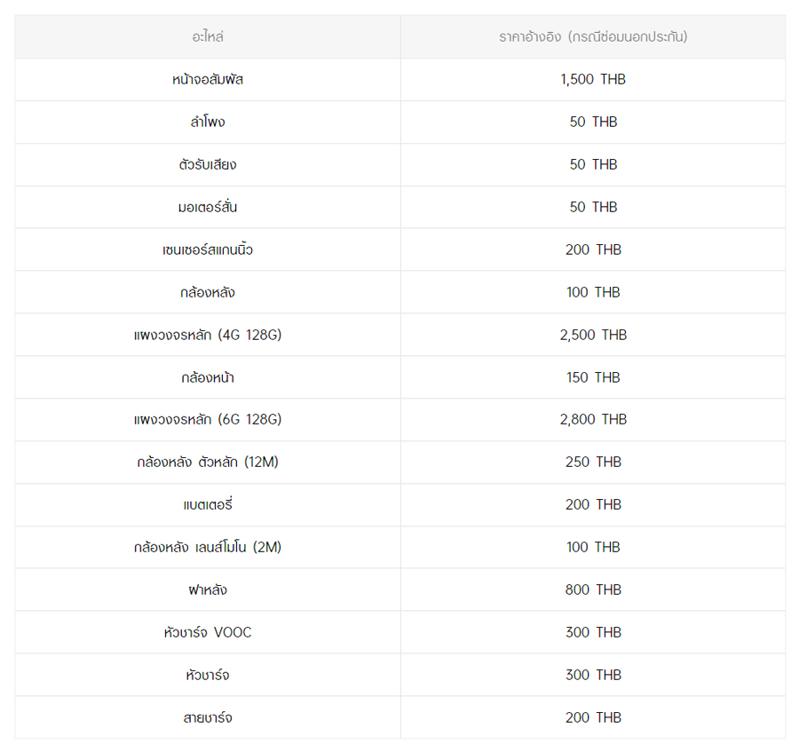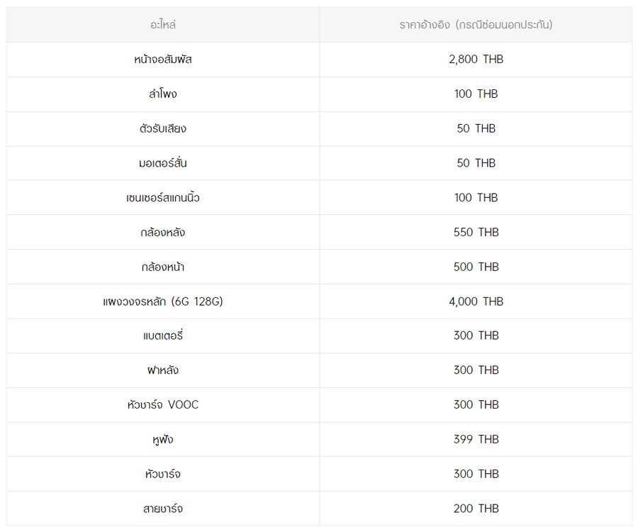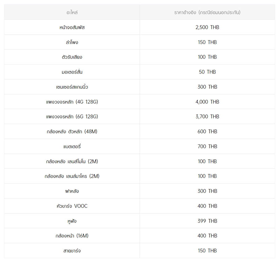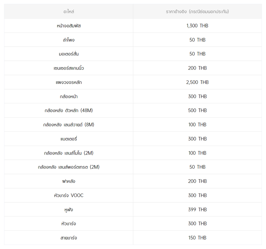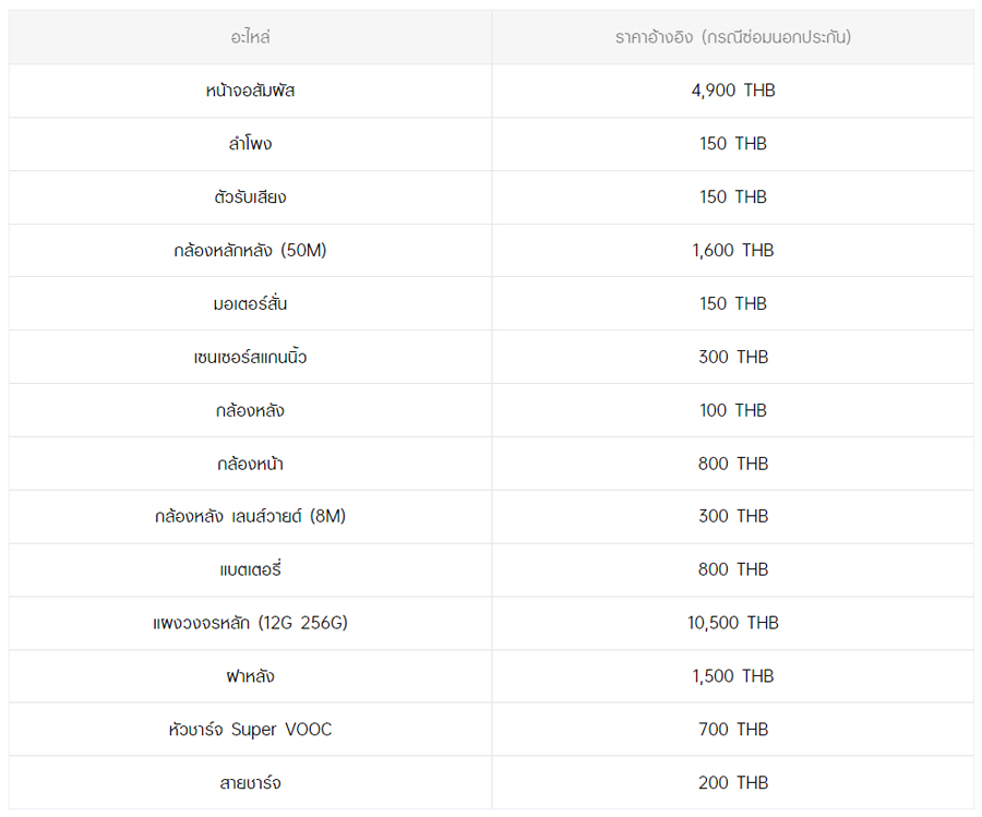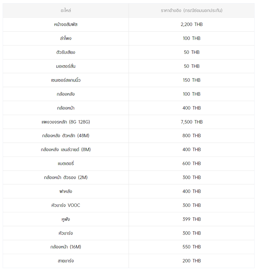 - หากต้องการทราบราคาในการซ่อมทั้งหมด สามารถสอบถามได้ ณ ศูนย์บริการออปโป้ หรือ OPPO Care