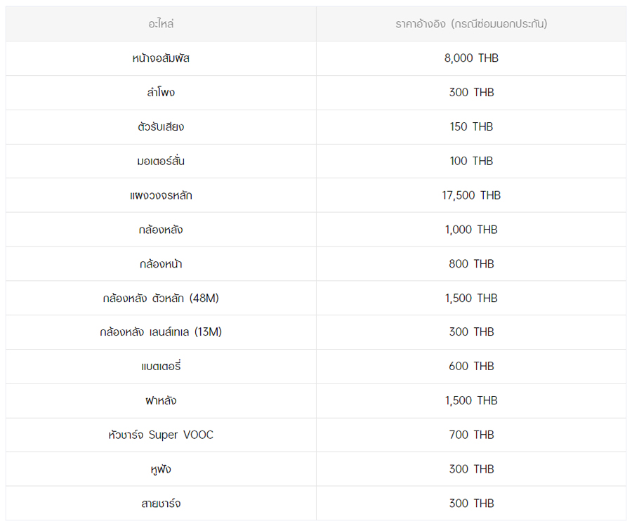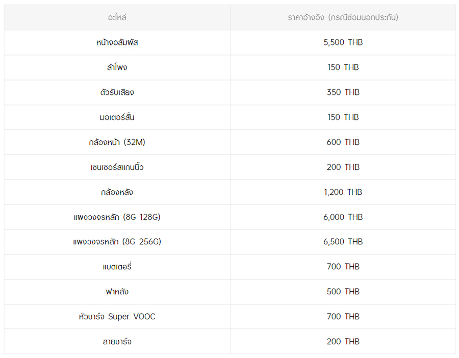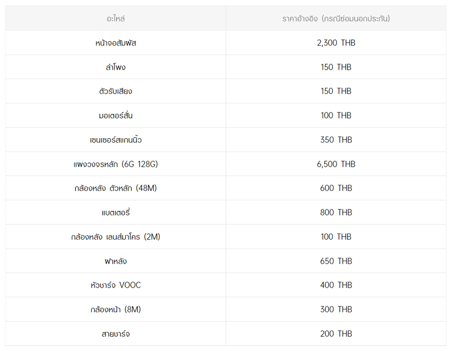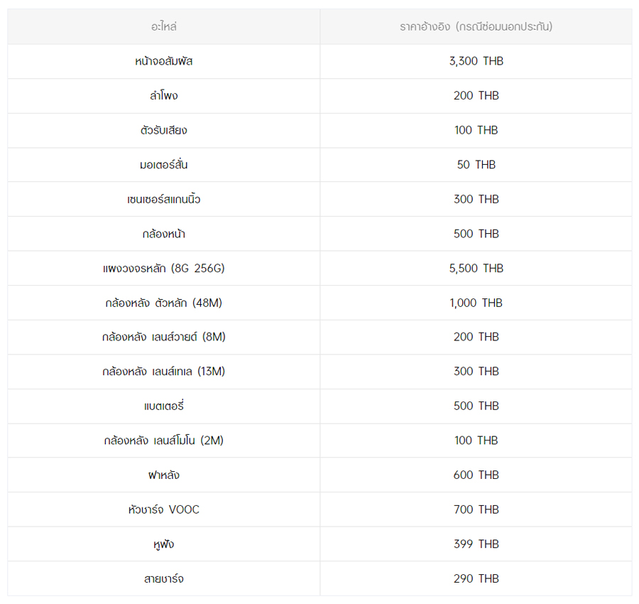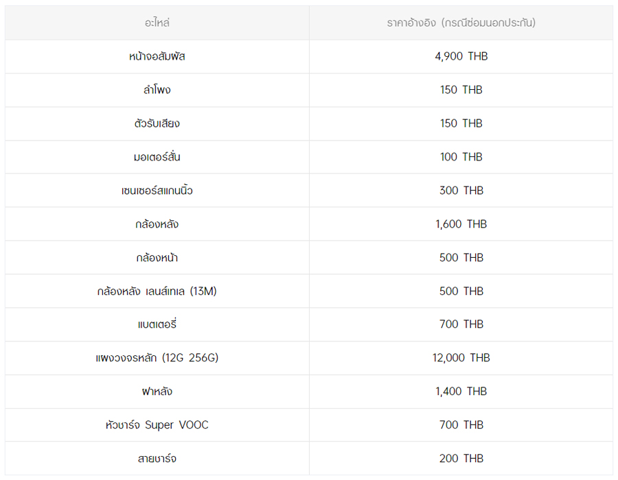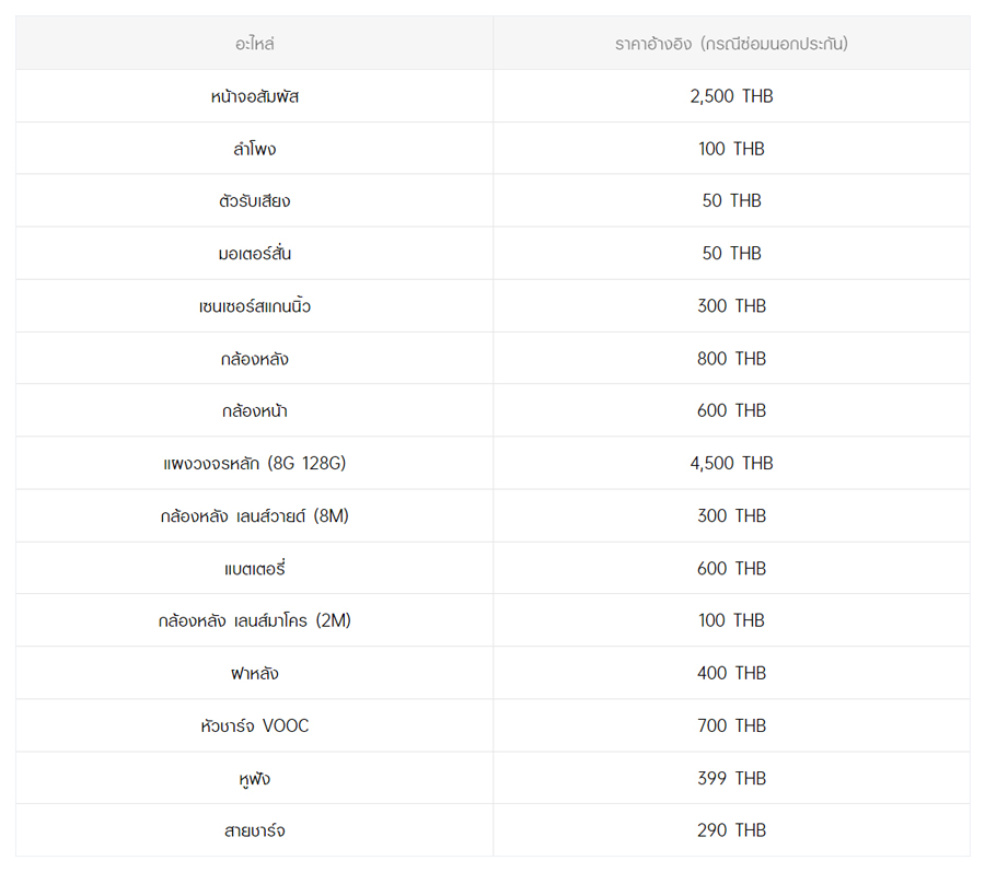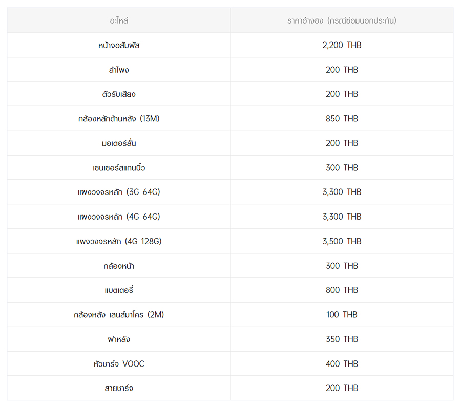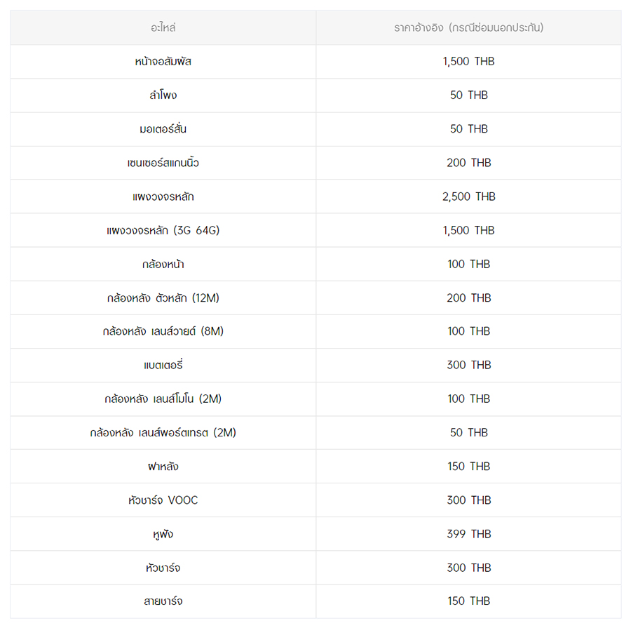 - หากต้องการทราบราคาในการซ่อมทั้งหมด สามารถสอบถามได้ ณ ศูนย์บริการออปโป้ หรือ OPPO Care